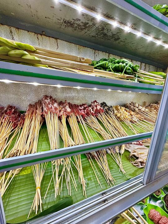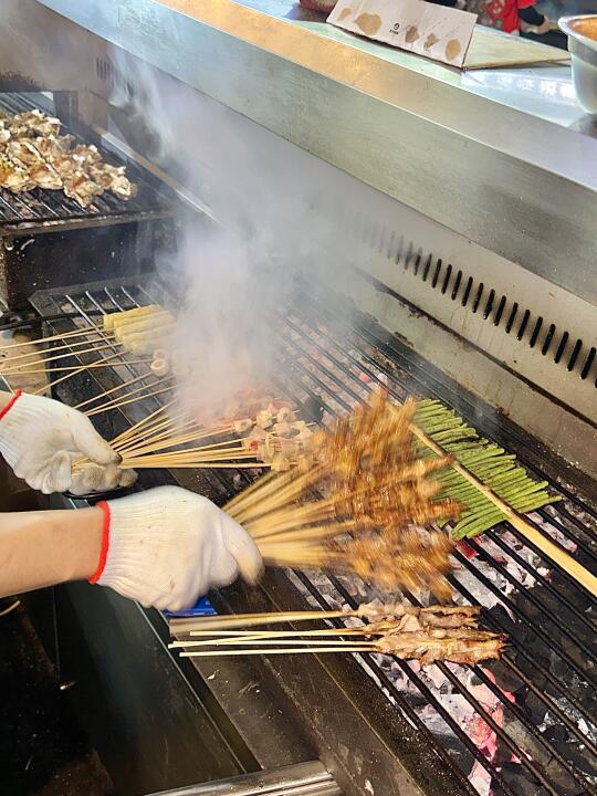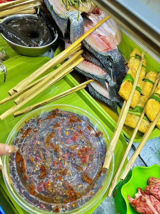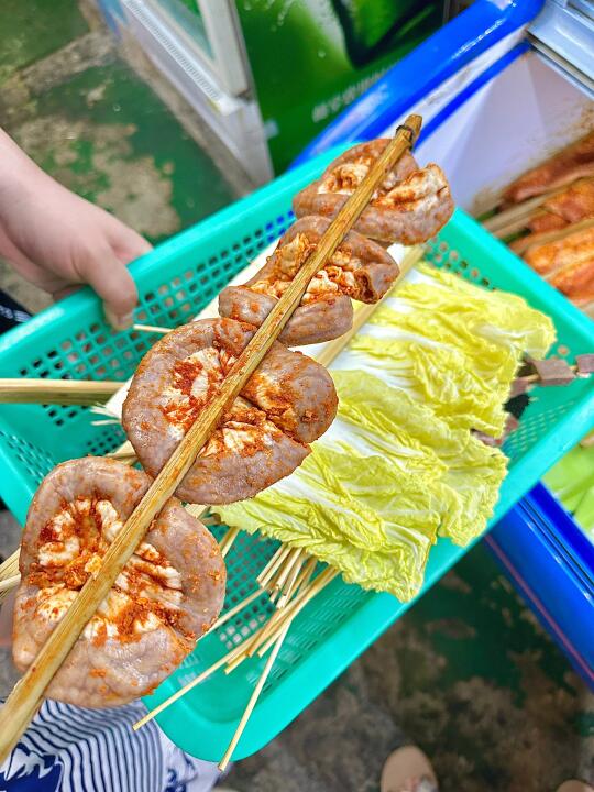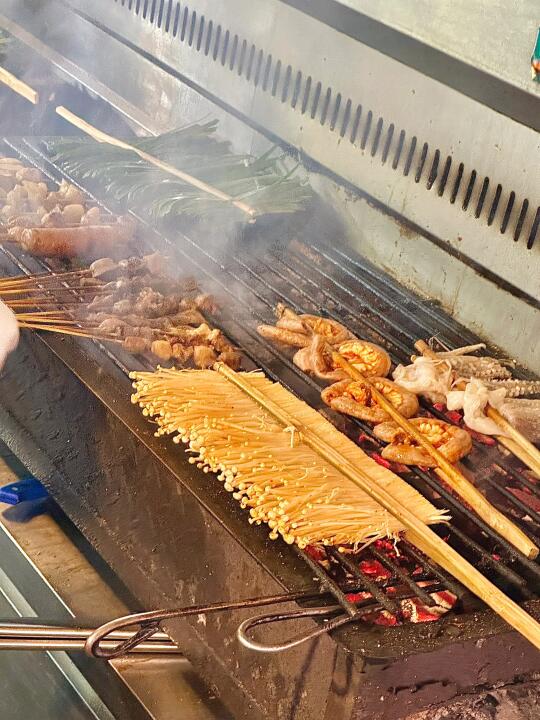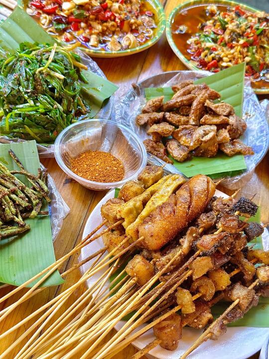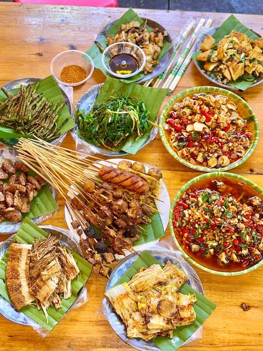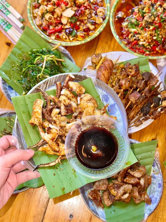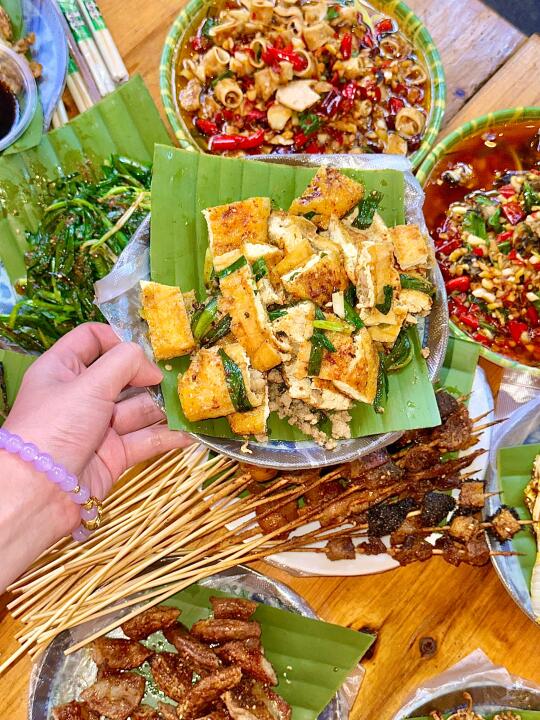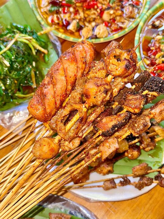 成间店晚黑坐满人,空气都系香辣炭烧味~人均70蚊左右,叫多几串五花肉、烤鱼都唔肉赤!坐喺路边枱吹住晚风,饮返杯冰啤酒,先至算真正体验版纳嘅夜生活啊嘛🌙
