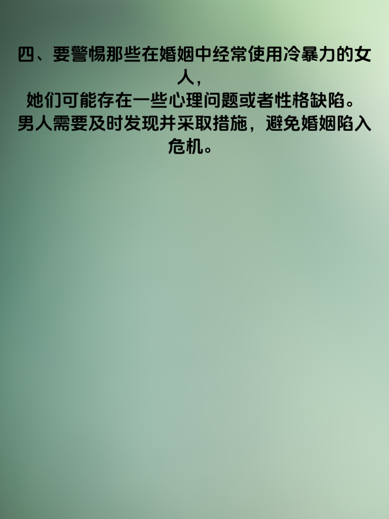 一、有些女人在婚姻中会选择冷暴力,她们可能表面上看似平静,内心却早已波涛汹涌。这种冷暴力往往会让男人在不知不觉中陷入痛苦的深渊。 二、这类女人通常善于隐藏自己的情绪,她们不会直接表达不满,而是通过冷漠、忽视等方式来对待男人。这种行为看似无形,却能对男人的心灵造成巨大的伤害。 三、男人在面对婚内冷暴力时,往往会感到迷茫和无助。他们不知道该如何应对这种情况,也不知道女人内心的真实想法。 四、要警惕那些在婚姻中经常使用冷暴力的女人,她们可能存在一些心理问题或者性格缺陷。男人需要及时发现并采取措施,避免婚姻陷入危机。