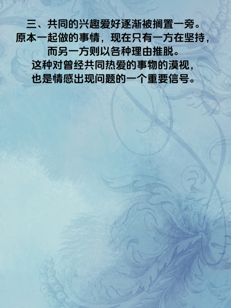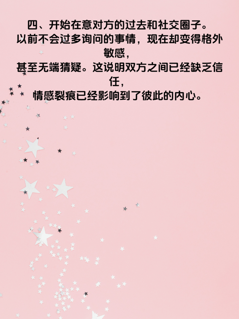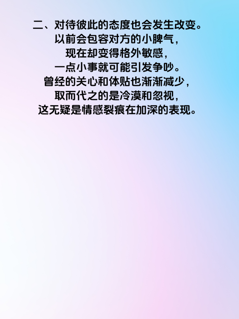 一、情感裂痕往往在细微之处悄然显现。比如曾经亲密无间的两人,开始减少沟通的频率,不再像以前那样分享生活的点滴。曾经每晚的电话粥变成了偶尔的短信问候,这种沟通上的变化就是裂痕的一个信号。 二、对待彼此的态度也会发生改变。以前会包容对方的小脾气,现在却变得格外敏感,一点小事就可能引发争吵。曾经的关心和体贴也渐渐减少,取而代之的是冷漠和忽视,这无疑是情感裂痕在加深的表现。 三、共同的兴趣爱好逐渐被搁置一旁。原本一起做的事情,现在只有一方在坚持,而另一方则以各种理由推脱。这种对曾经共同热爱的事物的漠视,也是情感出现问题的一个重要信号。 四、开始在意对方的过去和社交圈子。以前不会过多询问的事情,现在却变得格外敏感,甚至无端猜疑。这说明双方之间已经缺乏信任,情感裂痕已经影响到了彼此的内心。
