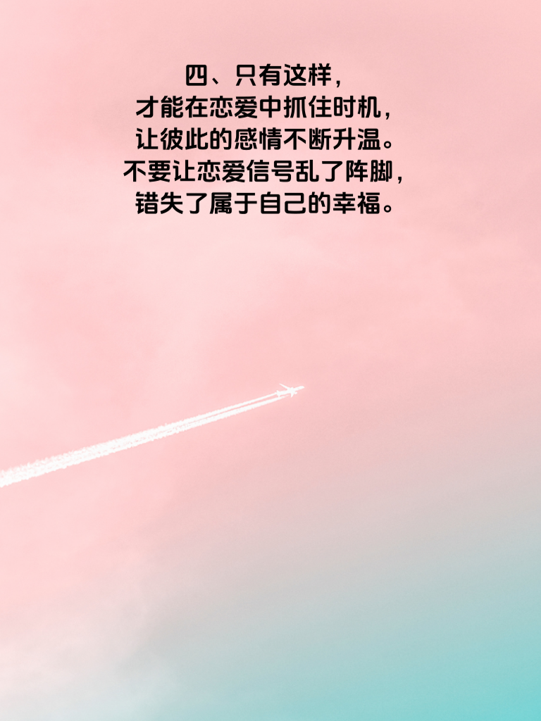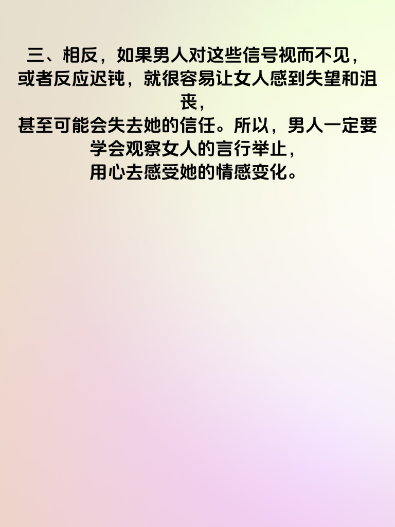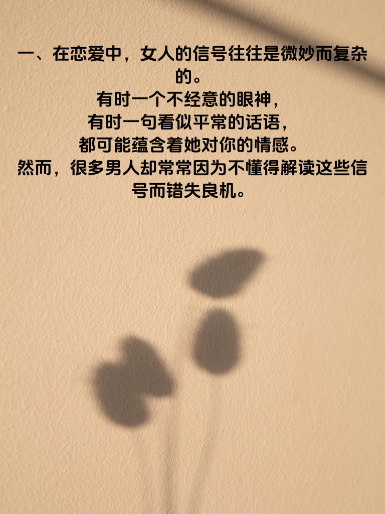 一、在恋爱中,女人的信号往往是微妙而复杂的。有时一个不经意的眼神,有时一句看似平常的话语,都可能蕴含着她对你的情感。然而,很多男人却常常因为不懂得解读这些信号而错失良机。 二、比如,当她开始频繁地关注你的一举一动,主动找你聊天,甚至在你面前表现出小女生的一面时,这就是她对你有好感的信号。此时,男人如果能敏锐地察觉到这些信号,并及时做出回应,往往能拉近彼此的距离。 三、相反,如果男人对这些信号视而不见,或者反应迟钝,就很容易让女人感到失望和沮丧,甚至可能会失去她的信任。所以,男人一定要学会观察女人的言行举止,用心去感受她的情感变化。 四、只有这样,才能在恋爱中抓住时机,让彼此的感情不断升温。不要让恋爱信号乱了阵脚,错失了属于自己的幸福。