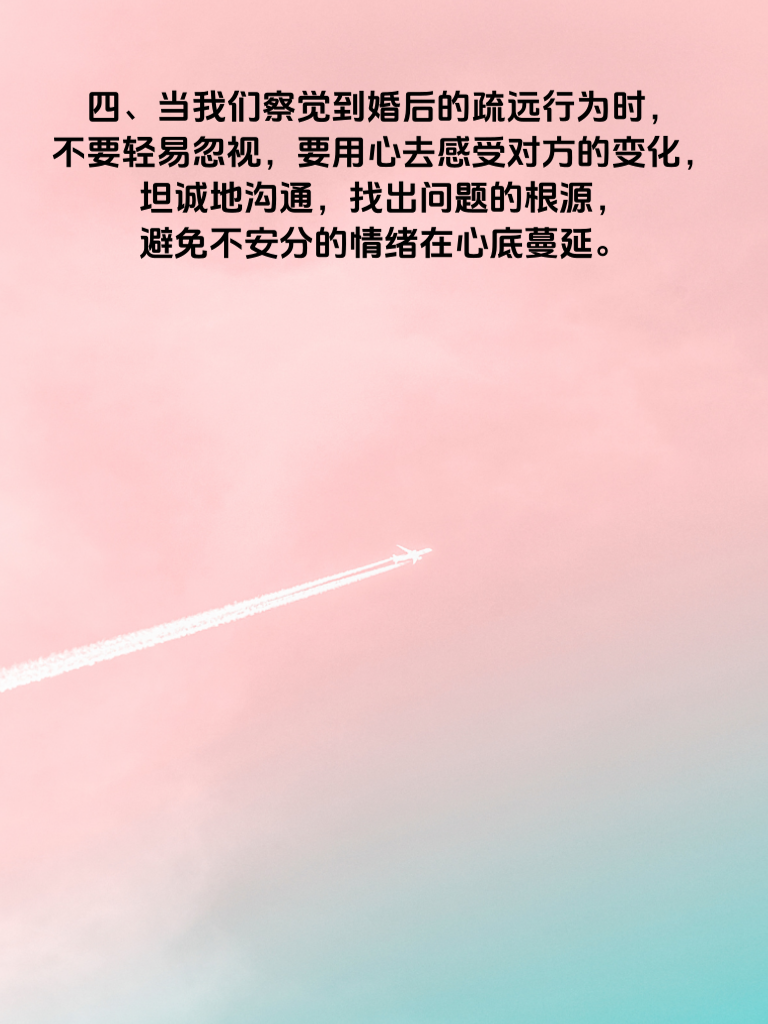 一、婚后的生活本应是甜蜜而紧密的,然而,当出现疏远行为时,那仿佛是平静湖面泛起的涟漪,暗示着可能隐藏着不安分的暗流。 二、这种疏远或许开始于一些细微的变化,比如不再像从前那样亲密地交流,眼神中的温度也渐渐降低。 三、它可能是一方在忙碌的生活中逐渐忽略了另一方的感受,也可能是内心的某种躁动在悄悄作祟。 四、当我们察觉到婚后的疏远行为时,不要轻易忽视,要用心去感受对方的变化,坦诚地沟通,找出问题的根源,避免不安分的情绪在心底蔓延。