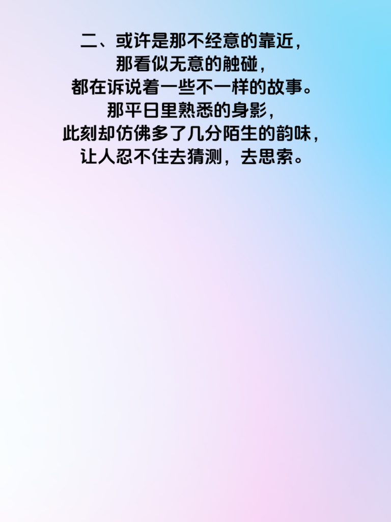 一、暧昧的室友,那微妙的氛围总是在空气中弥漫着,仿佛一层若有若无的轻纱。不经意间的眼神交汇,都能让心跳漏上一拍。如今动作的异常,更是让人心生警惕,那背后是否暗藏着未曾察觉的情愫呢? 二、或许是那不经意的靠近,那看似无意的触碰,都在诉说着一些不一样的故事。那平日里熟悉的身影,此刻却仿佛多了几分陌生的韵味,让人忍不住去猜测,去思索。 三、这种暧昧的状态,就像是一场即将揭开谜底的游戏,每一个细微的动作都可能成为关键的线索。我们在警惕的同时,内心又隐隐有着一丝期待,期待着那或许存在的情愫能够有一个明确的答案。 四、然而,我们不能被这暧昧冲昏了头脑,要保持清醒的认知。毕竟,暧昧并不等同于爱情,我们需要谨慎地对待,以免陷入不必要的烦恼和困惑。
