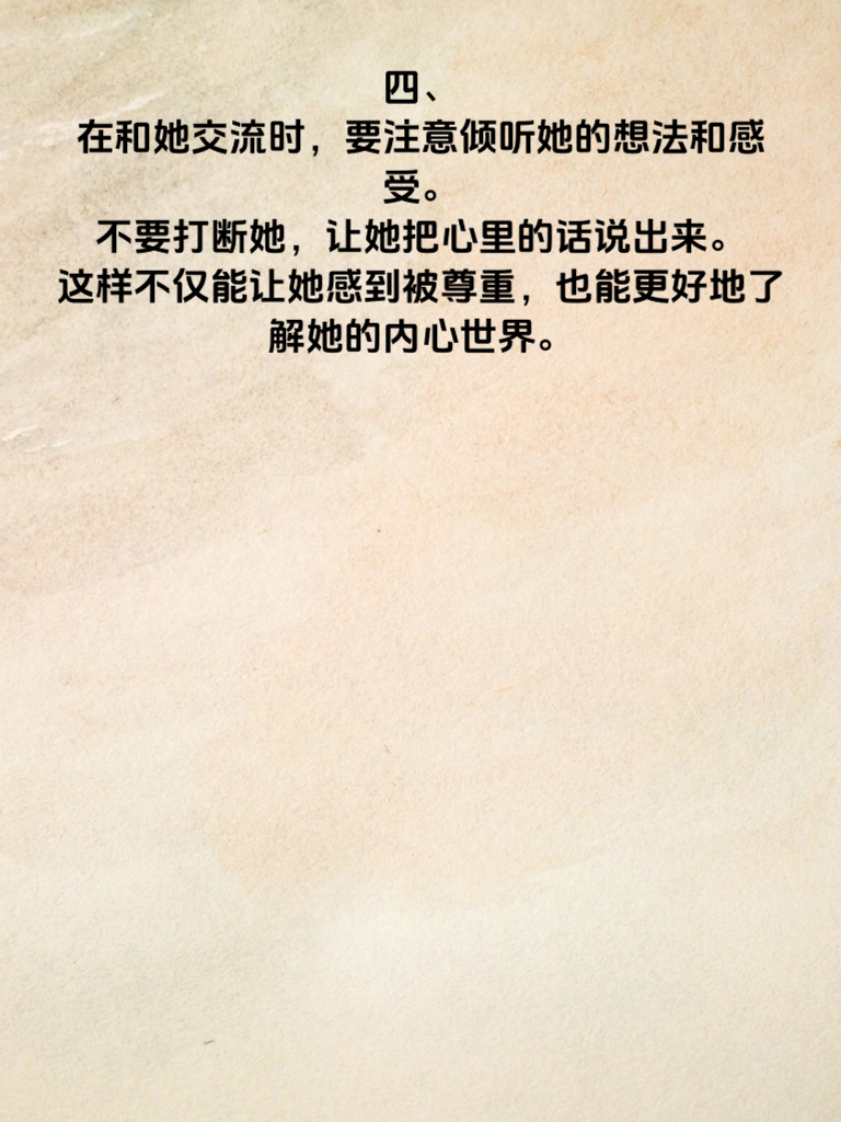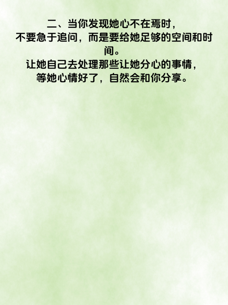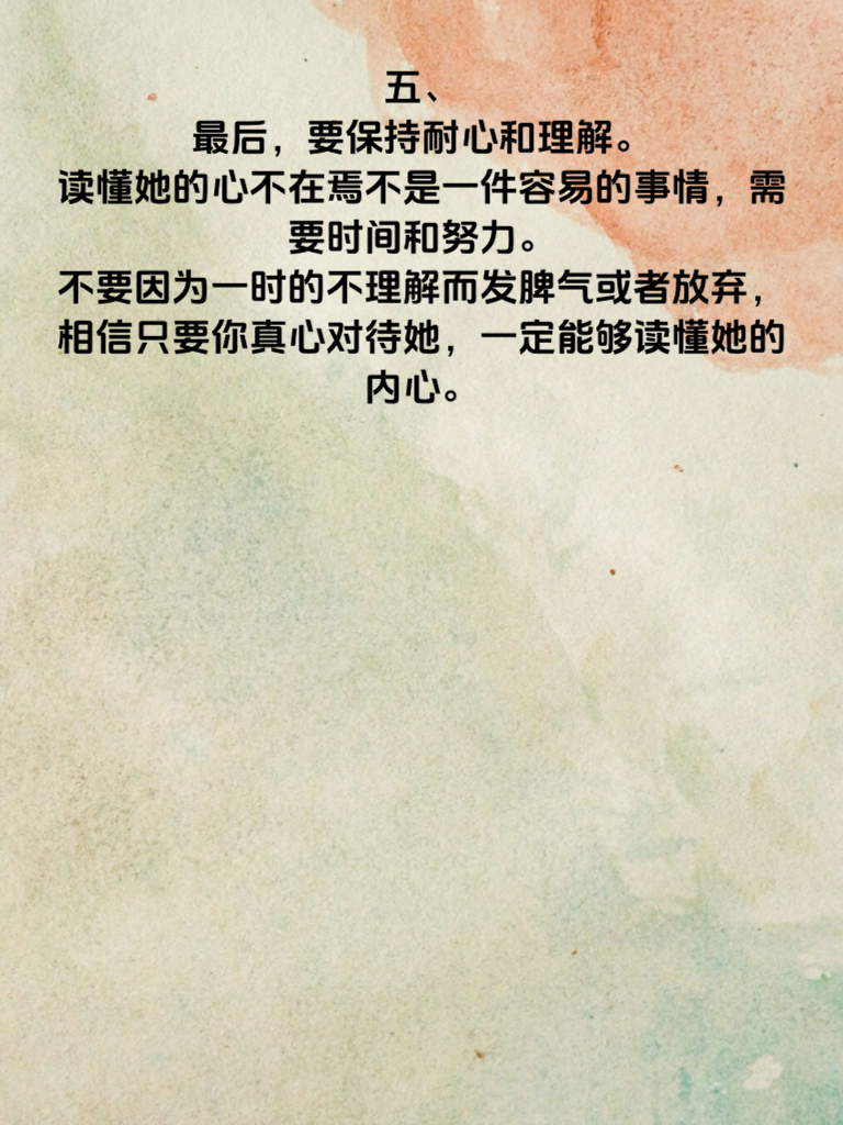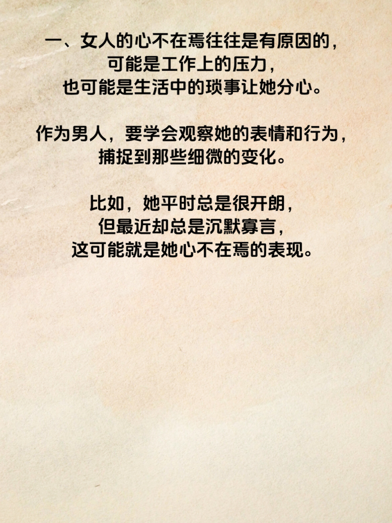 一、女人的心不在焉往往是有原因的,可能是工作上的压力,也可能是生活中的琐事让她分心。作为男人,要学会观察她的表情和行为,捕捉到那些细微的变化。比如,她平时总是很开朗,但最近却总是沉默寡言,这可能就是她心不在焉的表现。 二、当你发现她心不在焉时,不要急于追问,而是要给她足够的空间和时间。让她自己去处理那些让她分心的事情,等她心情好了,自然会和你分享。 三、可以通过一些小举动来关心她,比如给她泡一杯热茶,或者陪她一起做她喜欢的事情。这些小举动能够让她感受到你的关心和爱,也能让她更加愿意和你交流。 四、在和她交流时,要注意倾听她的想法和感受。不要打断她,让她把心里的话说出来。这样不仅能让她感到被尊重,也能更好地了解她的内心世界。 五、最后,要保持耐心和理解。读懂她的心不在焉不是一件容易的事情,需要时间和努力。不要因为一时的不理解而发脾气或者放弃,相信只要你真心对待她,一定能够读懂她的内心。