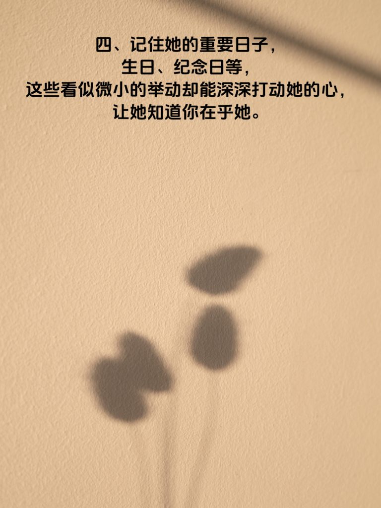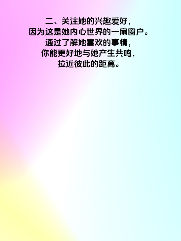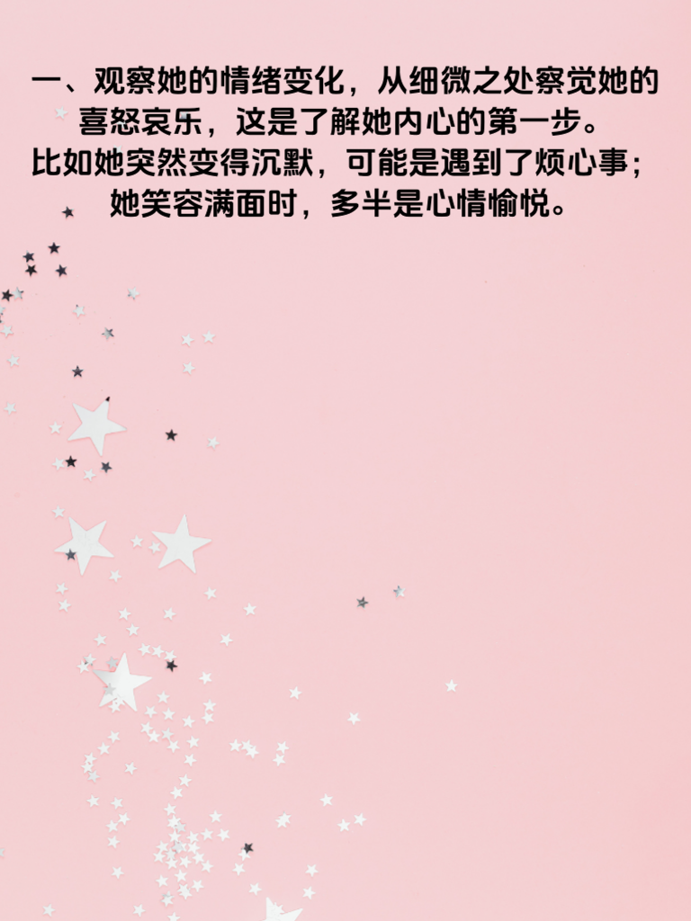 一、观察她的情绪变化,从细微之处察觉她的喜怒哀乐,这是了解她内心的第一步。比如她突然变得沉默,可能是遇到了烦心事;她笑容满面时,多半是心情愉悦。 二、关注她的兴趣爱好,因为这是她内心世界的一扇窗户。通过了解她喜欢的事情,你能更好地与她产生共鸣,拉近彼此的距离。 三、倾听她的倾诉,不要急于给出建议,让她把心里的话都说出来,这能让她感受到你的关心和尊重。 四、记住她的重要日子,生日、纪念日等,这些看似微小的举动却能深深打动她的心,让她知道你在乎她。 五、给予她足够的空间,不要过度束缚她,让她有自己的时间和空间去做自己喜欢的事情,这样她会更愿意与你分享她的生活。