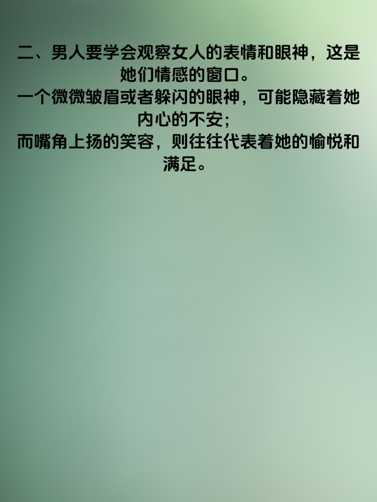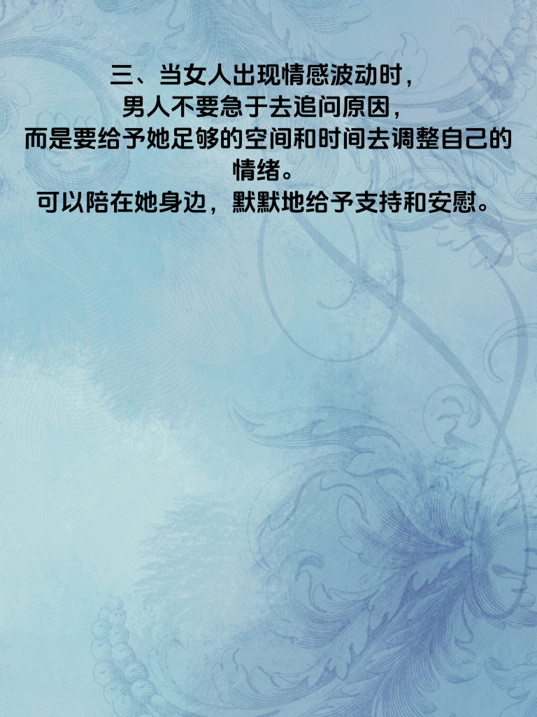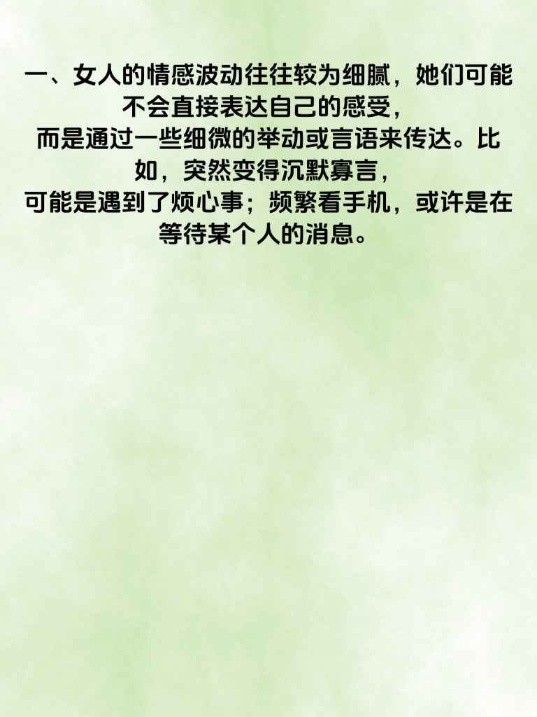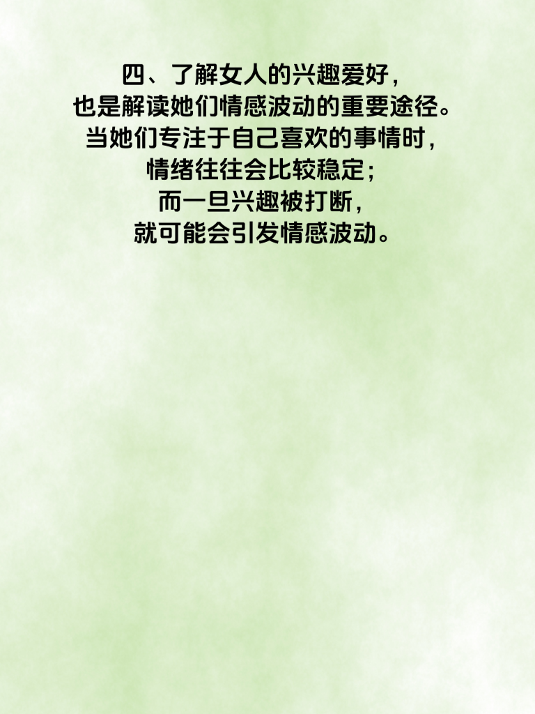 一、女人的情感波动往往较为细腻,她们可能不会直接表达自己的感受,而是通过一些细微的举动或言语来传达。比如,突然变得沉默寡言,可能是遇到了烦心事;频繁看手机,或许是在等待某个人的消息。 二、男人要学会观察女人的表情和眼神,这是她们情感的窗口。一个微微皱眉或者躲闪的眼神,可能隐藏着她内心的不安;而嘴角上扬的笑容,则往往代表着她的愉悦和满足。 三、当女人出现情感波动时,男人不要急于去追问原因,而是要给予她足够的空间和时间去调整自己的情绪。可以陪在她身边,默默地给予支持和安慰。 四、了解女人的兴趣爱好也是解读她们情感波动的重要途径。当她们专注于自己喜欢的事情时,情绪往往会比较稳定;而一旦兴趣被打断,就可能会引发情感波动。 五、在与女人相处中,男人要保持敏感和细心,及时察觉到她的情感变化,并做出相应的反应。这样才能更好地理解她,增进彼此的感情。