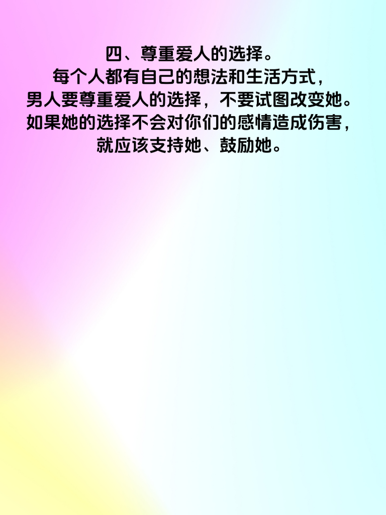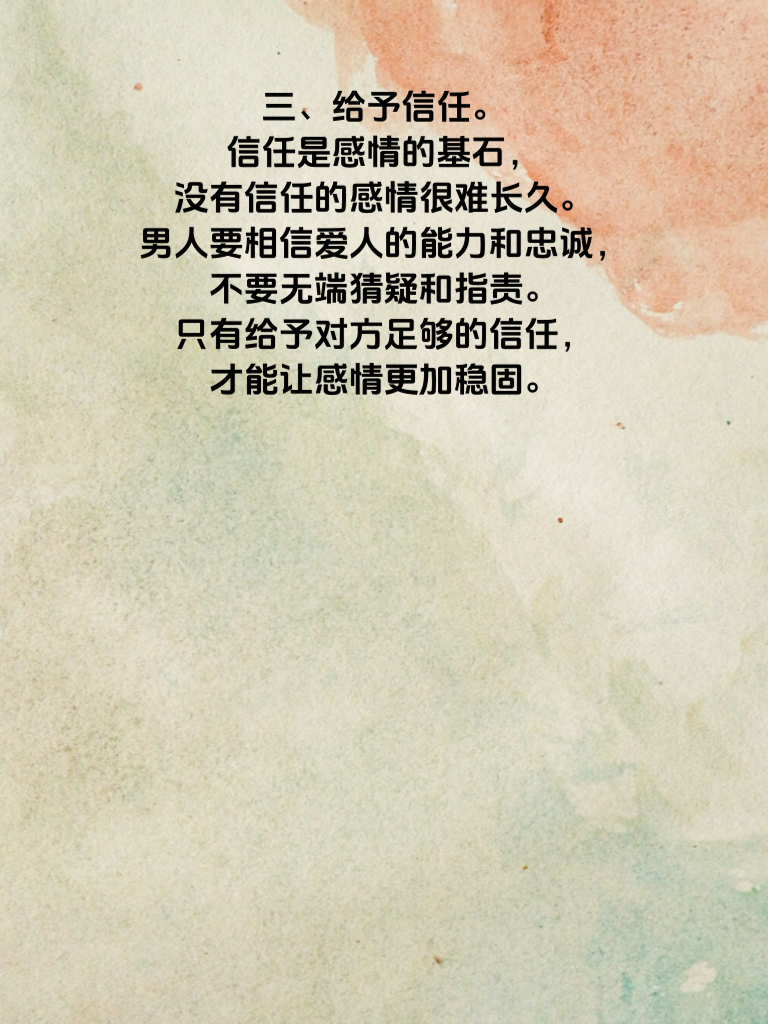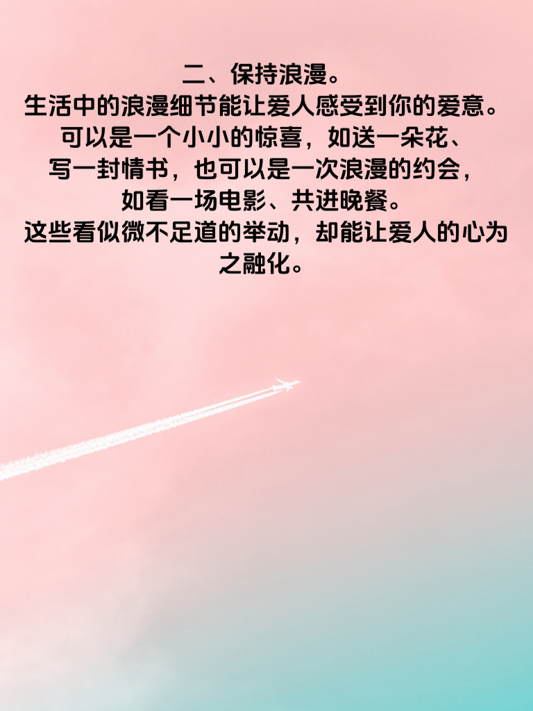 一、男人要学会倾听。在感情中,倾听远比表达自己更重要。当爱人想要倾诉时,要放下手中的事情,专注地听她说话,给予她足够的关注和理解。这能让她感受到你对她的重视,从而拉近你们之间的距离。 二、保持浪漫。生活中的浪漫细节能让爱人感受到你的爱意。可以是一个小小的惊喜,如送一朵花、写一封情书,也可以是一次浪漫的约会,如看一场电影、共进晚餐。这些看似微不足道的举动,却能让爱人的心为之融化。 三、给予信任。信任是感情的基石,没有信任的感情很难长久。男人要相信爱人的能力和忠诚,不要无端猜疑和指责。只有给予对方足够的信任,才能让感情更加稳固。 四、尊重爱人的选择。每个人都有自己的想法和生活方式,男人要尊重爱人的选择,不要试图改变她。如果她的选择不会对你们的感情造成伤害,就应该支持她、鼓励她。 五、不断提升自己。在感情中,男人也要不断提升自己,让自己变得更加优秀。这样不仅能让自己更有魅力,也能为爱人提供更好的生活。