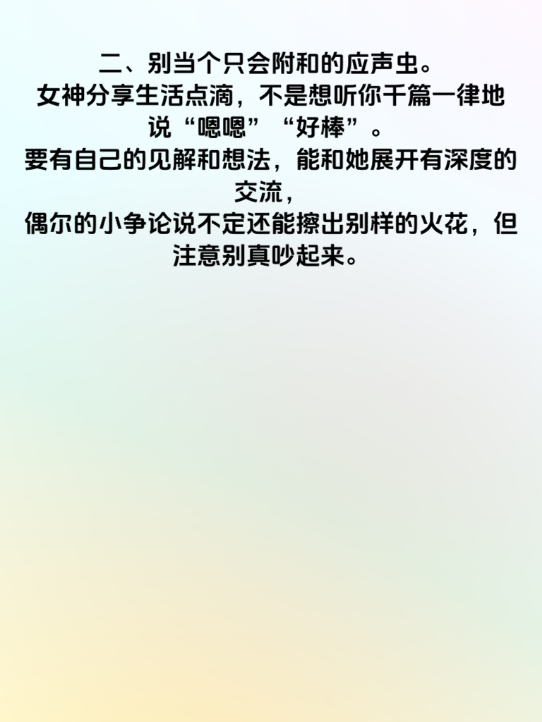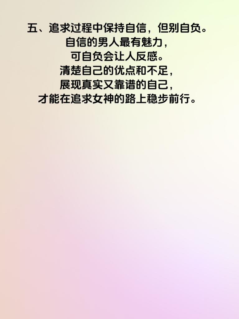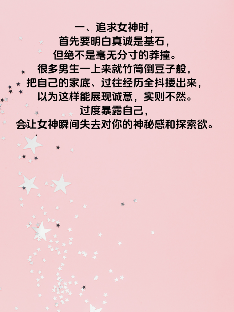 一、追求女神时,首先要明白真诚是基石,但绝不是毫无分寸的莽撞。很多男生一上来就竹筒倒豆子般把自己的家底、过往经历全抖搂出来,以为这样能展现诚意,实则不然。过度暴露自己,会让女神瞬间失去对你的神秘感和探索欲。 二、别当个只会附和的应声虫。女神分享生活点滴,不是想听你千篇一律地说“嗯嗯”“好棒”。要有自己的见解和想法,能和她展开有深度的交流,偶尔的小争论说不定还能擦出别样的火花,但注意别真吵起来。 三、送礼物也有大学问。别一股脑选那些昂贵却不走心的奢侈品。用心准备一份独一无二的小礼物,比如她一直念叨的一本书、亲手做的一份小点心,更能打动她的心。 四、千万别在她面前贬低其他女生。这会让她觉得你人品有问题,说不定哪天你也会在别人面前这样说她。尊重其他女性,也是在为自己加分。 五、追求过程中保持自信,但别自负。自信的男人最有魅力,可自负会让人反感。清楚自己的优点和不足,展现真实又靠谱的自己,才能在追求女神的路上稳步前行。