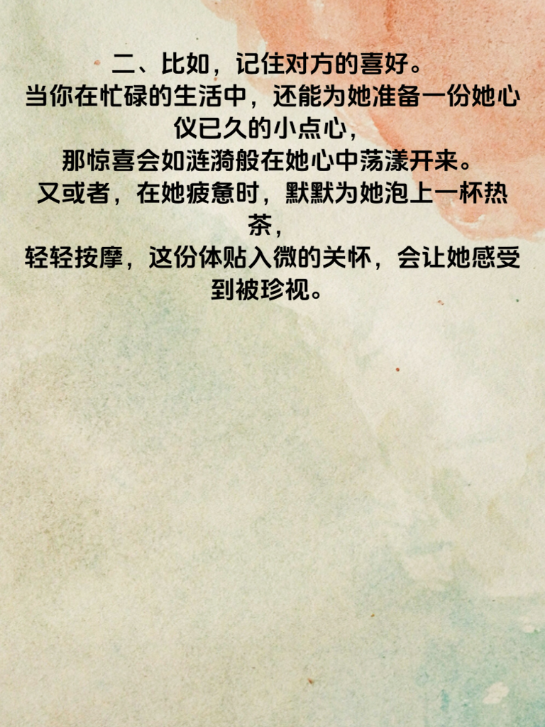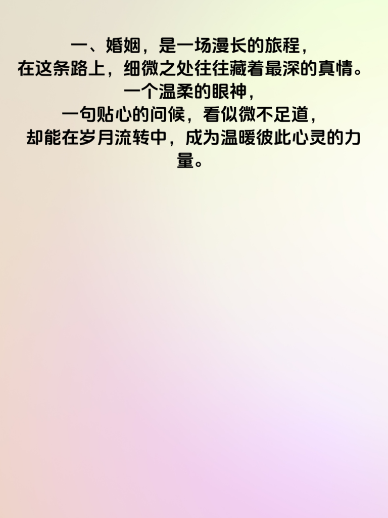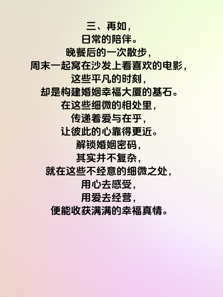 一、婚姻,是一场漫长的旅程,在这条路上,细微之处往往藏着最深的真情。一个温柔的眼神,一句贴心的问候,看似微不足道,却能在岁月流转中,成为温暖彼此心灵的力量。 二、比如,记住对方的喜好。当你在忙碌的生活中,还能为她准备一份她心仪已久的小点心,那惊喜会如涟漪般在她心中荡漾开来。又或者,在她疲惫时,默默为她泡上一杯热茶,轻轻按摩,这份体贴入微的关怀,会让她感受到被珍视。 三、再如,日常的陪伴。晚餐后的一次散步,周末一起窝在沙发上看喜欢的电影,这些平凡的时刻,却是构建婚姻幸福大厦的基石。在这些细微的相处里,传递着爱与在乎,让彼此的心靠得更近。解锁婚姻密码,其实并不复杂,就在这些不经意的细微之处,用心去感受,用爱去经营,便能收获满满的幸福真情。