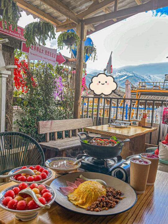 二楼还有个雪山观景位,直面雪山🏔️好惬意呀‼️坐在二楼的位置,边吃牦牛肉小香锅一边看雪山🏔️也太好看咯吧!随便一拍就像明信片一样❤️
