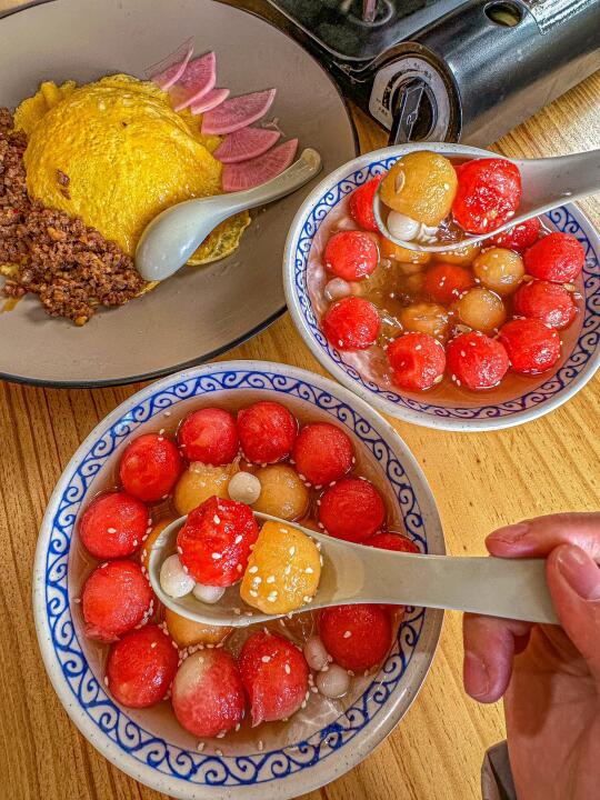西瓜+哈密瓜+糯叽小丸子+冰粉、冷冰甜丝,马上解晒腻!