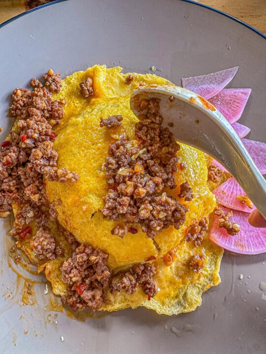 味道一个字jue 👍云南干巴菌和炒香🉐牦牛肉碎,腌萝卜,还有再被蛋皮包裹着蛋包饭,搅拌均匀一口下去菌香爆炸,肉碎混合蛋包饭真香😭