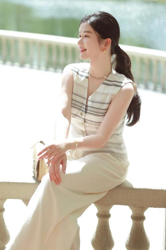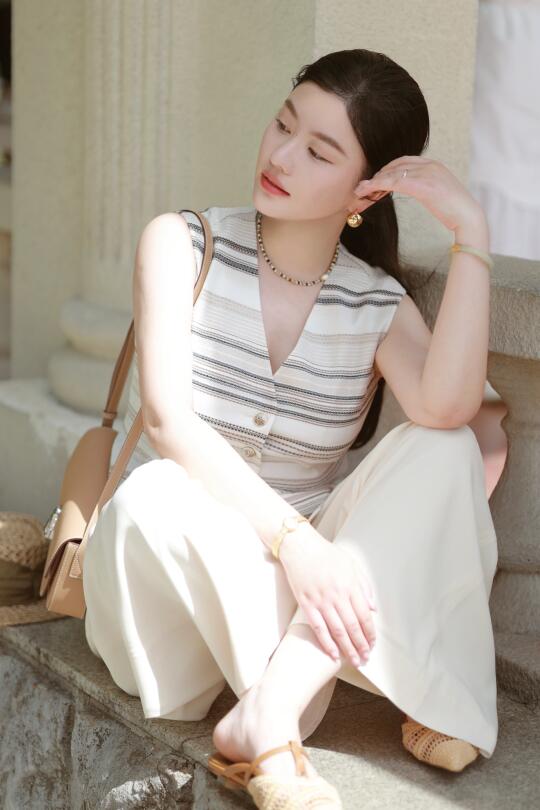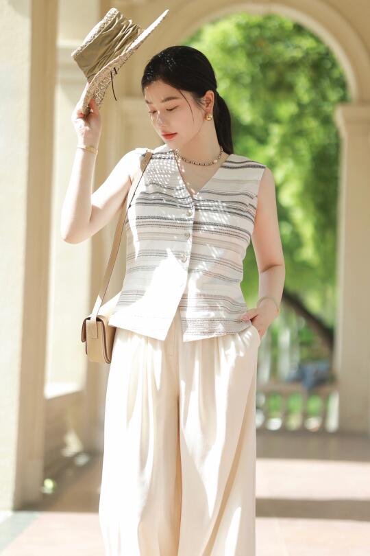 一件老钱风麻质条纹马甲