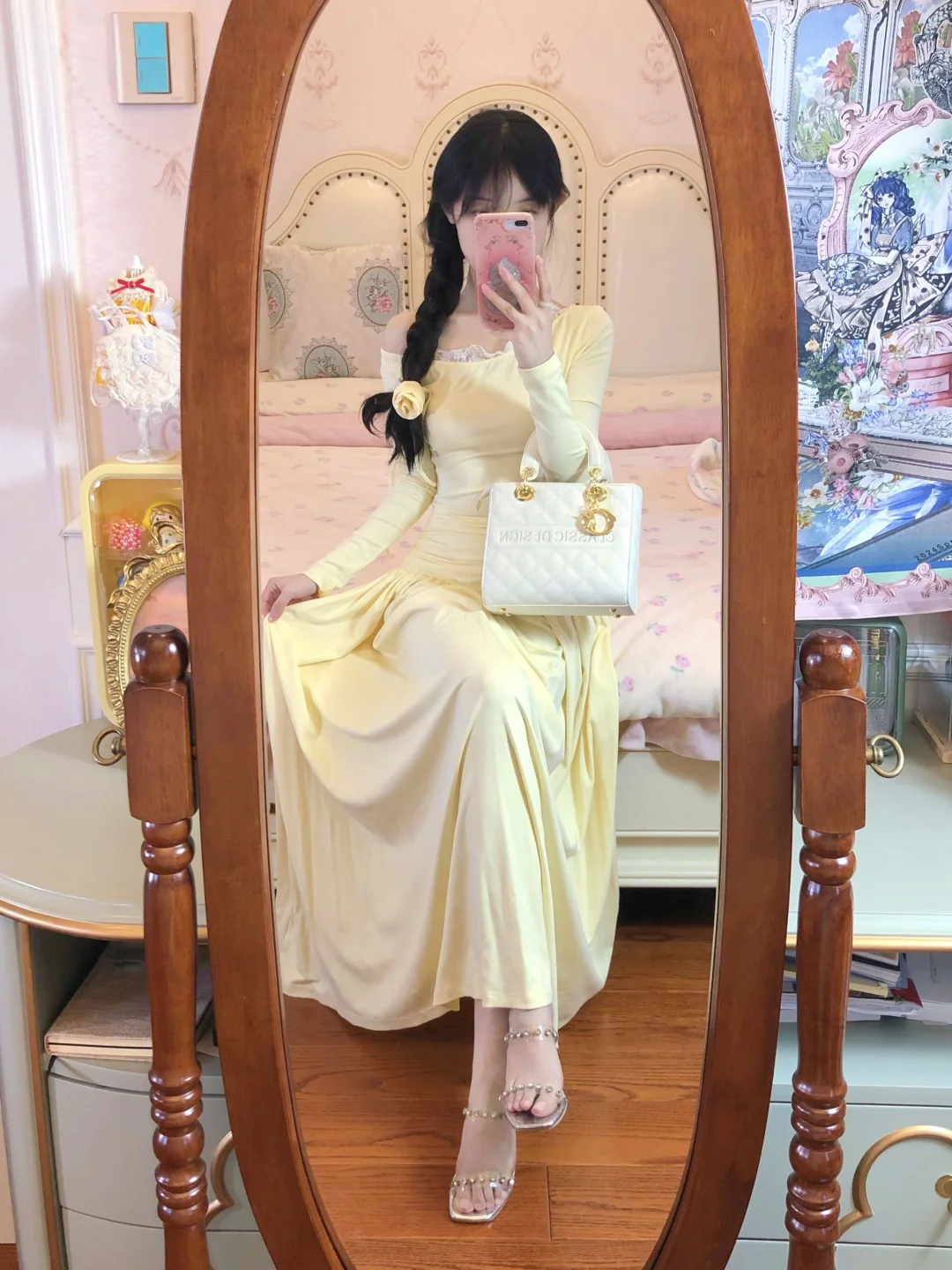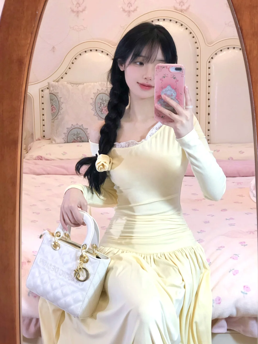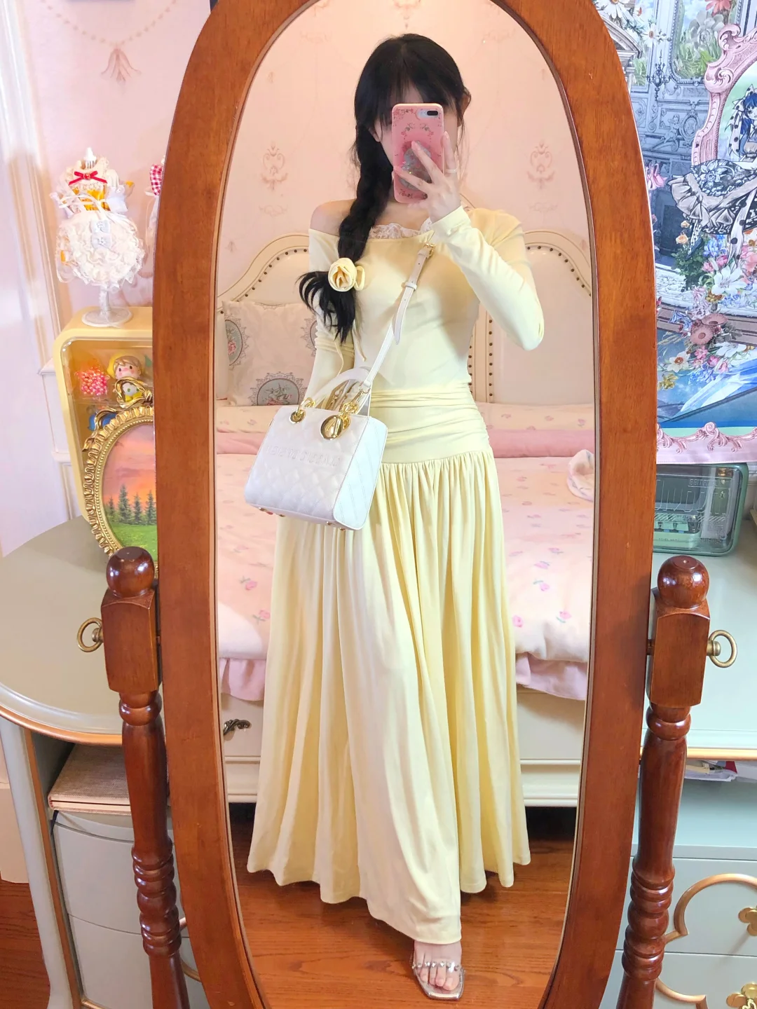 来拍照了 约会甜美裙装 淡黄的长裙蓬松的头发 温柔风