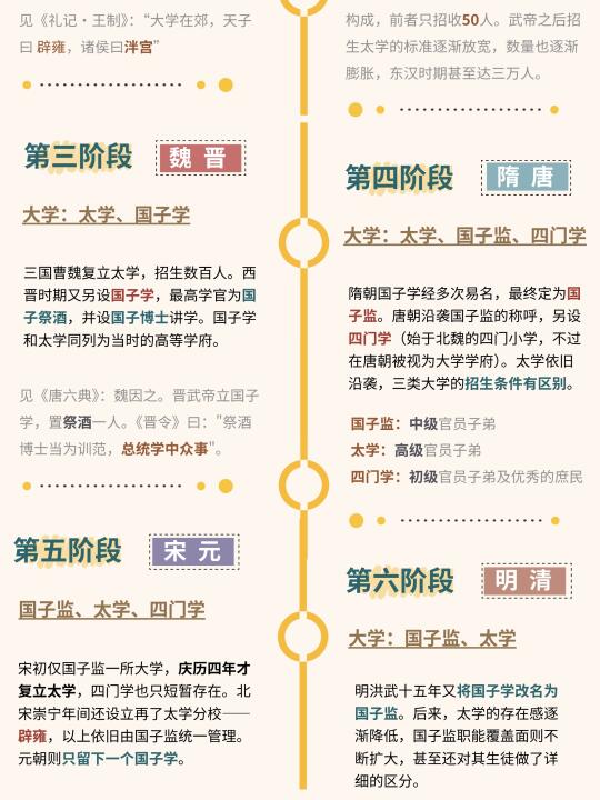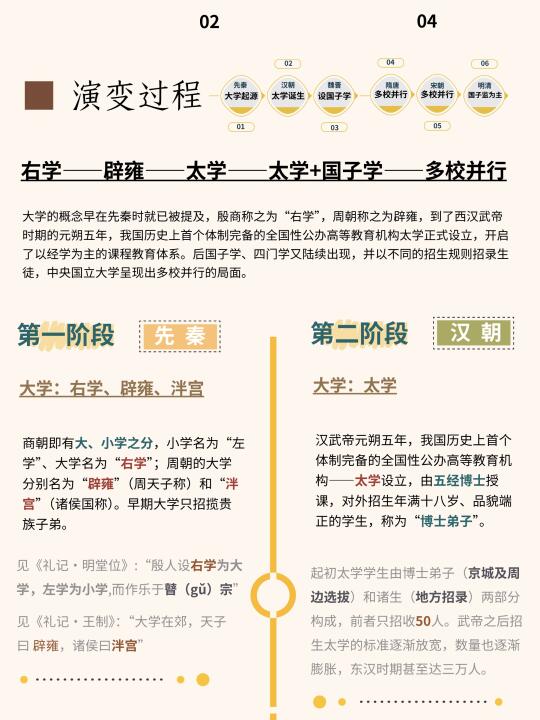“大学”的概念早在先秦时就已被提及,殷商时称其为“右学”(小学则被称为“左学”),周朝时称其为辟雍和泮(pàn)宫,但先秦的大学制度还没那么完备,直西汉武帝时期的元朔五年的“太学”设立,并罢黜百家,独尊儒术,将儒学《五经》作为主要教育课程,才正式开启了以官学教育机构为主导的局面。