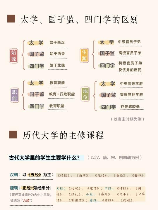 相较于太学,国子学的生源卡得比较严,多以高级官员子弟为主。当然,它还具有教育行政职能,比如唐宋时期中央的国立学校很多,除了太学、国子监、四门学等大学学府之外,还有各类技术性专科学府(算学、律学、书学等),这些皆由国子监管理。