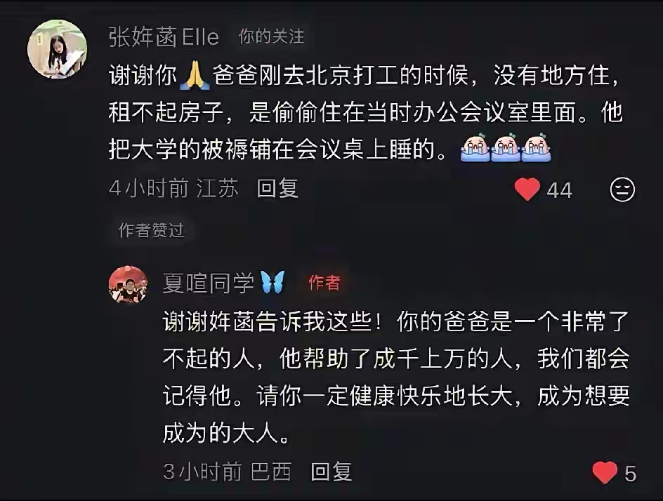 在另一个视频的评论区,张姩菡也表达了谢意,并首次披露了张雪峰创业初期的一些辛酸往事,称爸爸刚去北京打工的时候,没钱租房子,没有地方住,于是就偷偷住在公司会议室里面,晚上的时候就把大学期间的被褥铺在会议桌上睡觉。