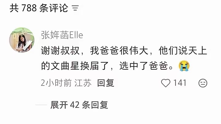 在一位博主悼念张雪峰的视频评论区,张姩菡留言表示感谢,称爸爸很伟大,大家都说天上的文曲星换届了,然后就选中了爸爸。