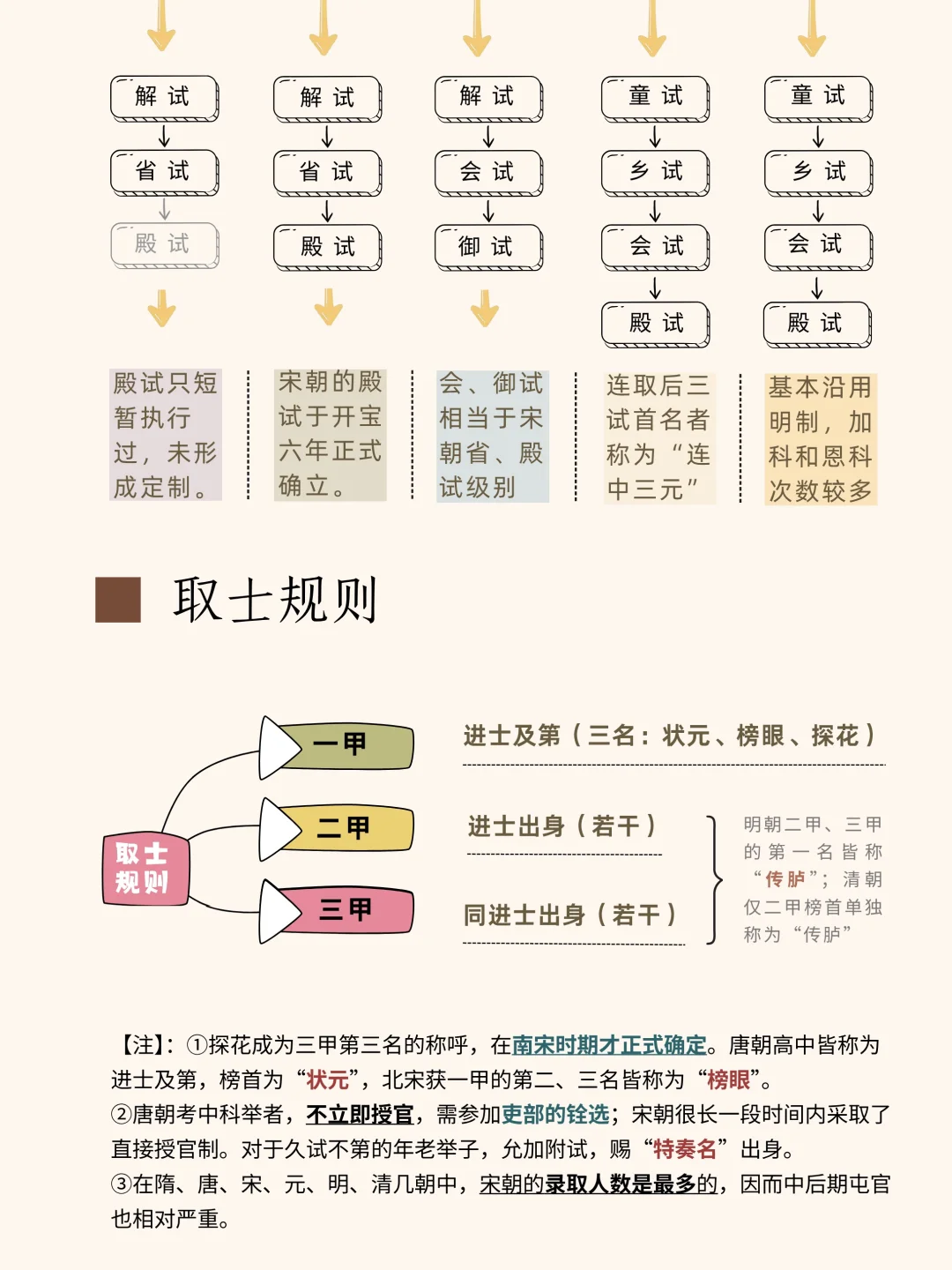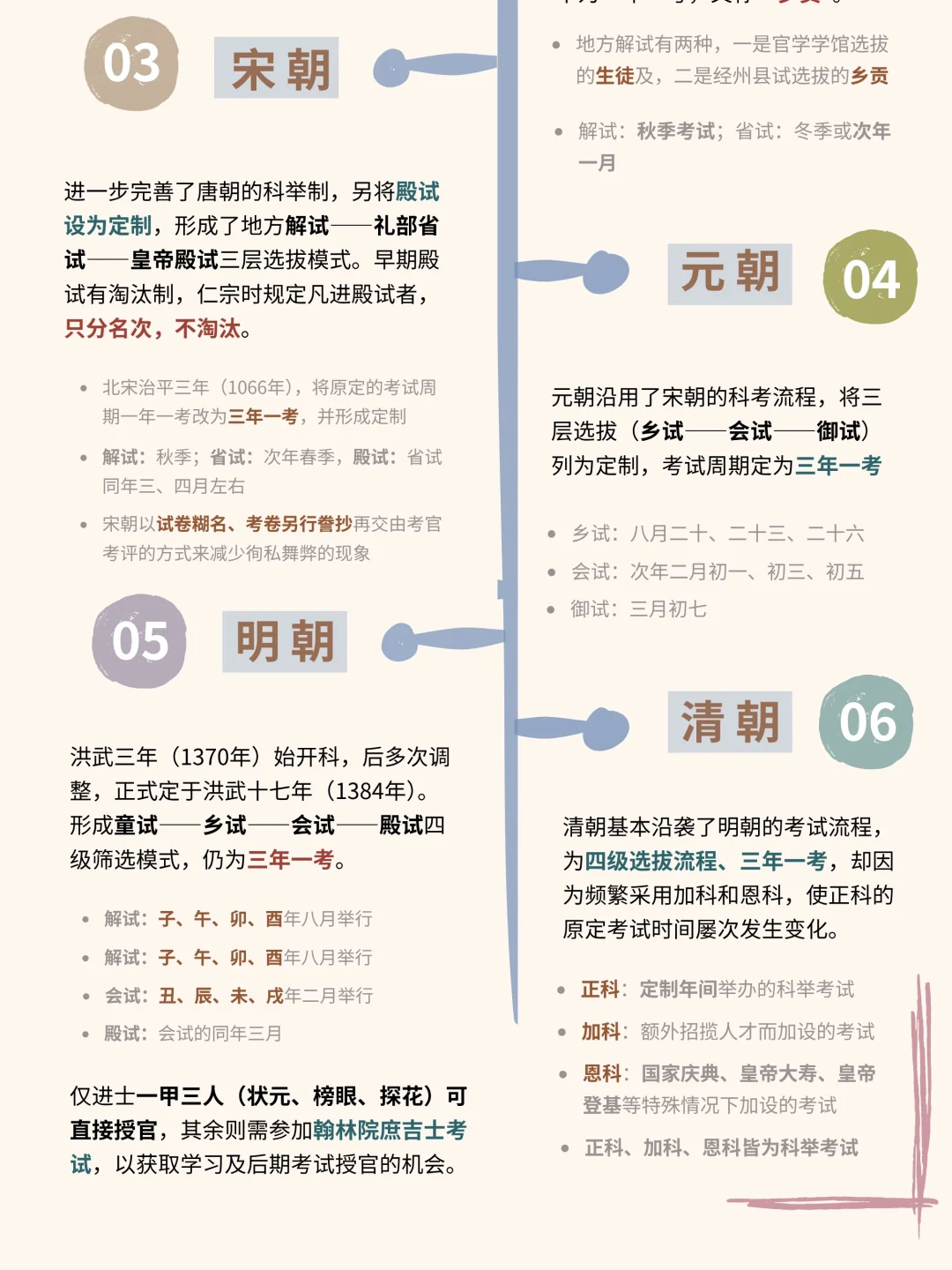 宋朝是科举考试制度变革的关键时期,一是明确了由州县(解试)到礼部(省试)、皇帝(殿试)的三层选拔模式,二是采取了考试糊名(唐朝始有,未成定制)、考卷誊录、锁院制(将主考官与别院隔离)等方式来进一步减少徇私舞弊之现象。