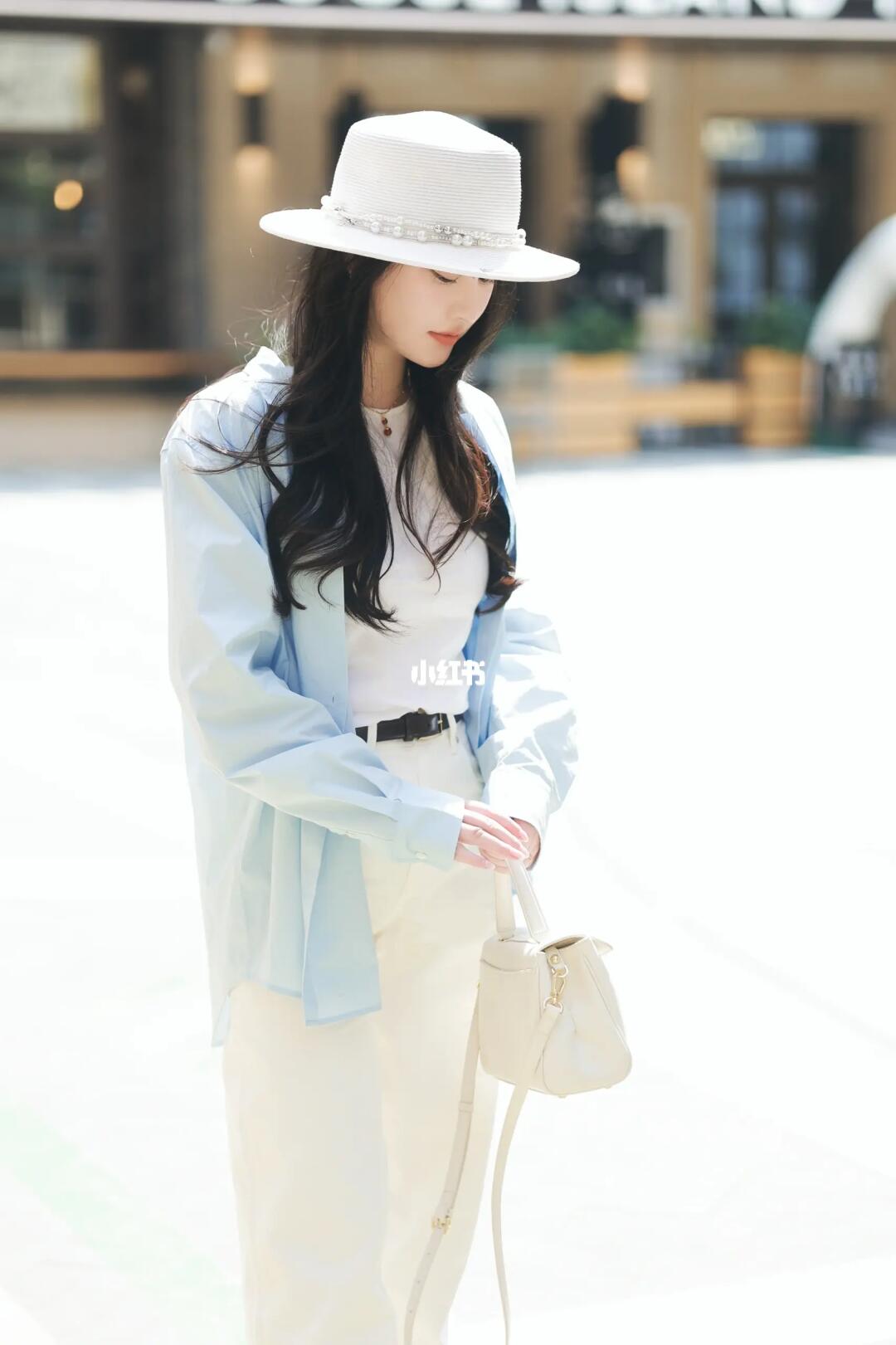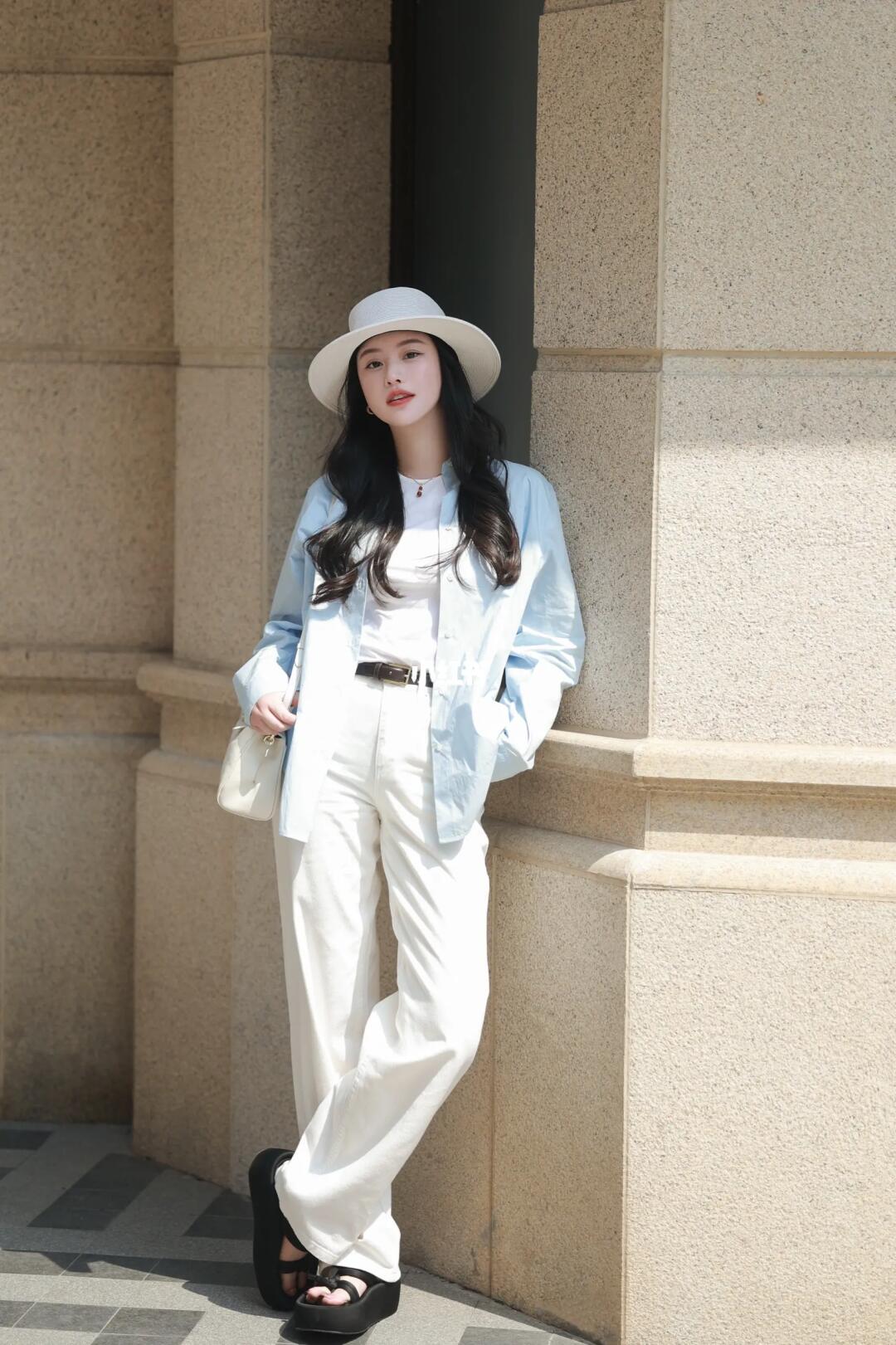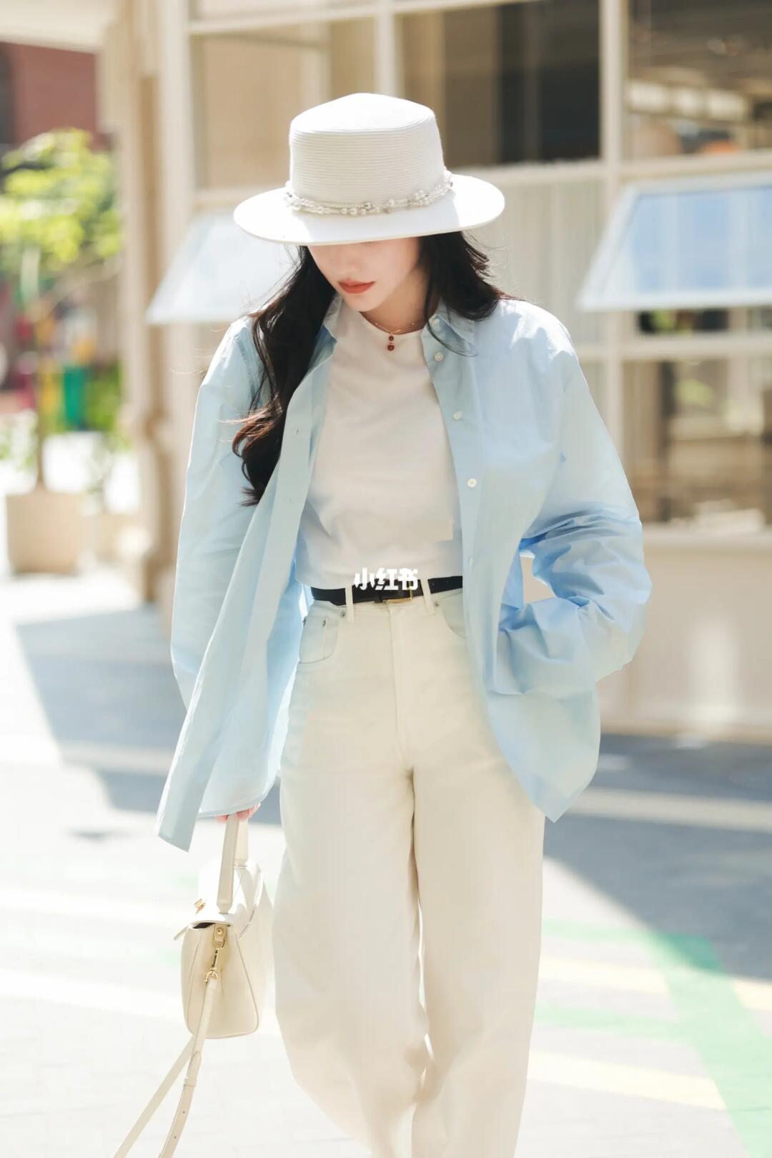 🤍一身白,简洁高级显气质 🌰深色配饰增加层次 🧊高支蓝衬衫则是💯防晒服