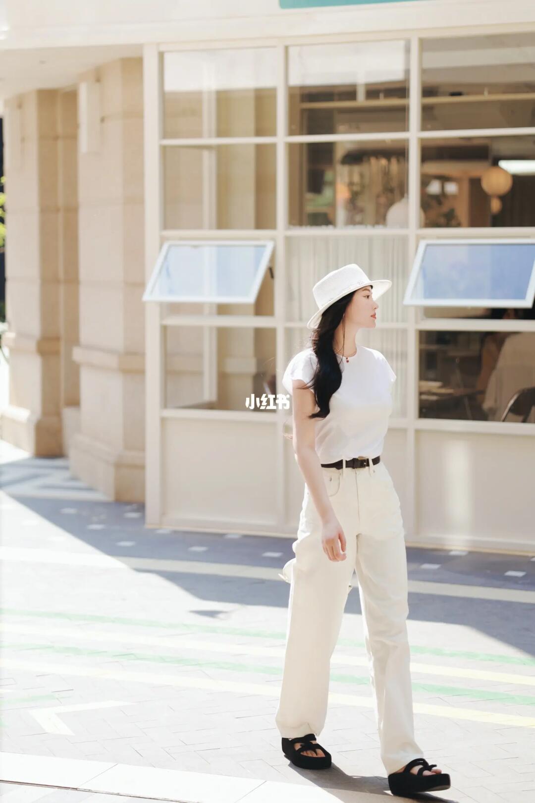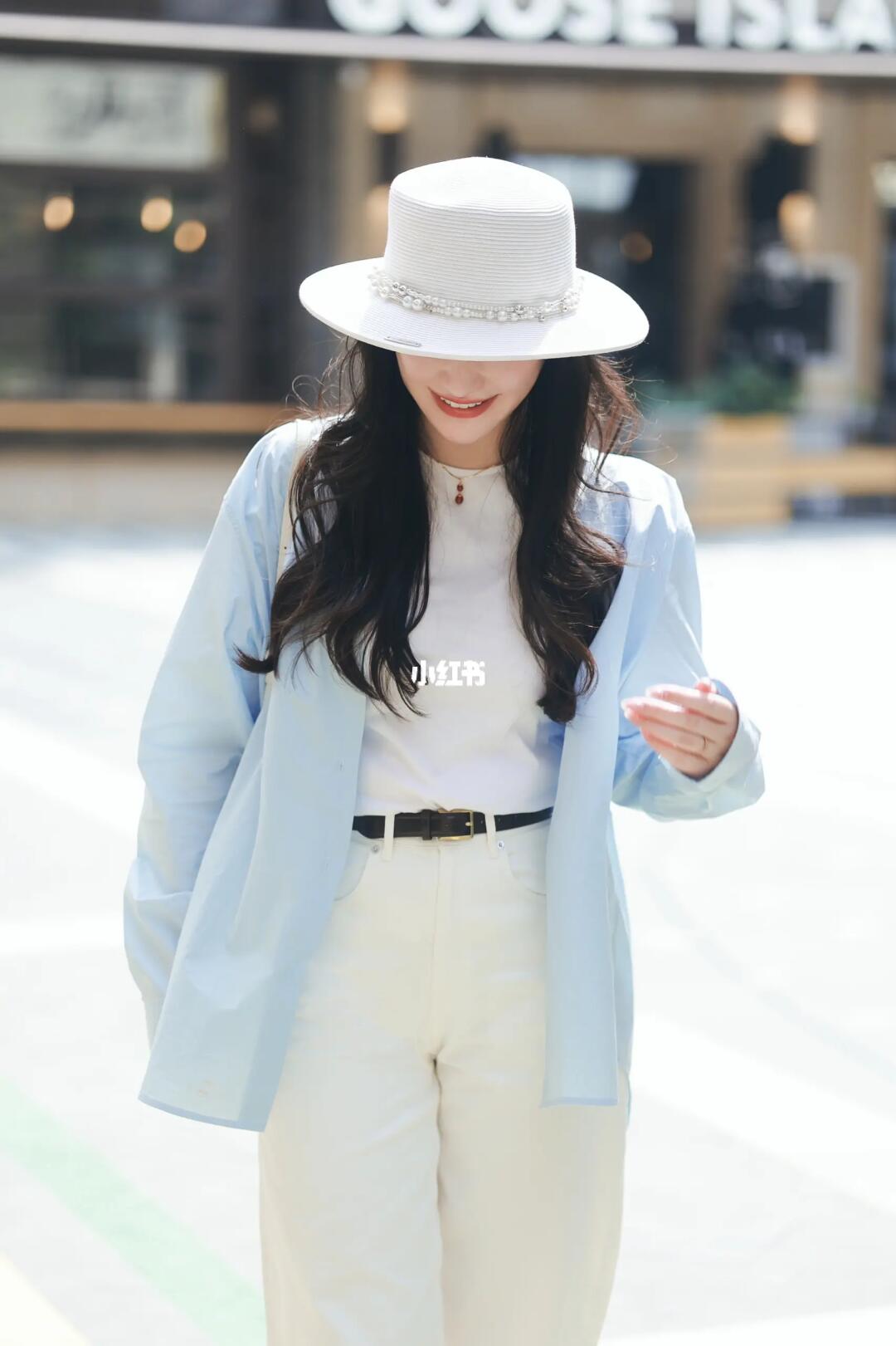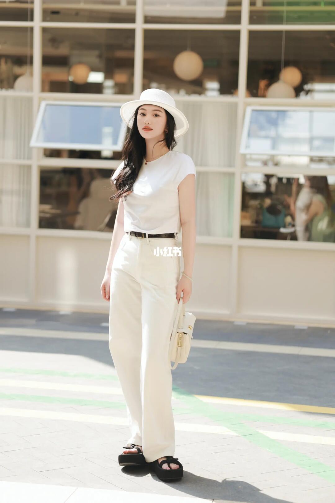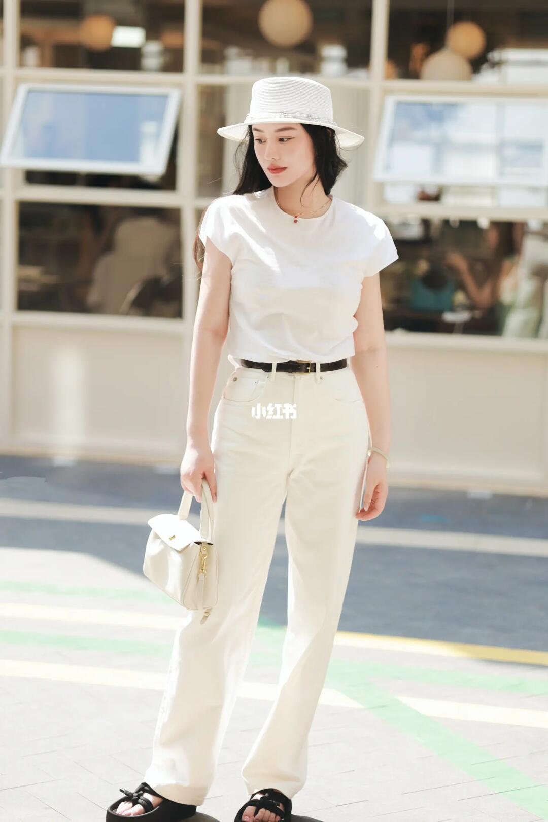 🤍一身白,简洁高级显气质 🌰深色配饰增加层次 🧊高支蓝衬衫则是💯防晒服