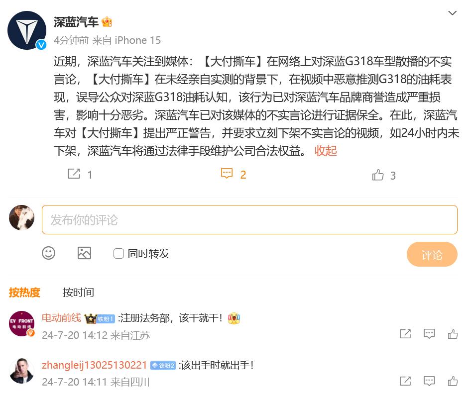 深蓝G318将直播测试油耗,结果会是网传的那么夸张吗? 刚刚,深蓝汽车针对某自媒体恶意造谣G318油耗数据,正式发出警告函,同时宣布将在21日来一场直播测试,看看真实油耗有没有网传的那么夸张。