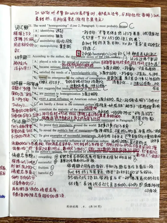 🎉🎉词汇猜测题正常的逻辑是根据上下文的逻辑取相同/想反,所以即便不认识“同化”这个词,也能根据前半部分的意思推断。