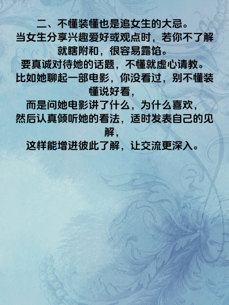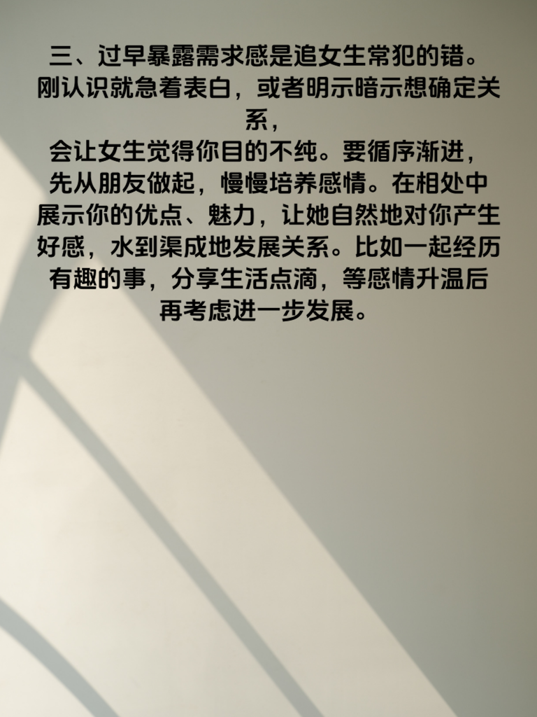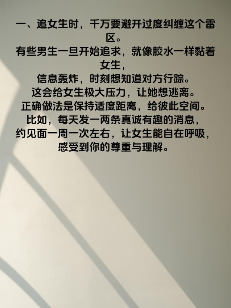 一、追女生时,千万要避开过度纠缠这个雷区。有些男生一旦开始追求,就像胶水一样黏着女生,信息轰炸,时刻想知道对方行踪。这会给女生极大压力,让她想逃离。正确做法是保持适度距离,给彼此空间。比如,每天发一两条真诚有趣的消息,约见面一周一次左右,让女生能自在呼吸,感受到你的尊重与理解。 二、不懂装懂也是追女生的大忌。当女生分享兴趣爱好或观点时,若你不了解就瞎附和,很容易露馅。要真诚对待她的话题,不懂就虚心请教。比如她聊起一部电影,你没看过,别不懂装懂说好看,而是问她电影讲了什么,为什么喜欢,然后认真倾听她的看法,适时发表自己的见解,这样能增进彼此了解,让交流更深入。 三、过早暴露需求感是追女生常犯的错。刚认识就急着表白,或者明示暗示想确定关系,会让女生觉得你目的不纯。要循序渐进,先从朋友做起,慢慢培养感情。在相处中展示你的优点、魅力,让她自然地对你产生好感,水到渠成地发展关系。比如一起经历有趣的事,分享生活点滴,等感情升温后再考虑进一步发展。