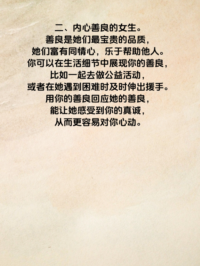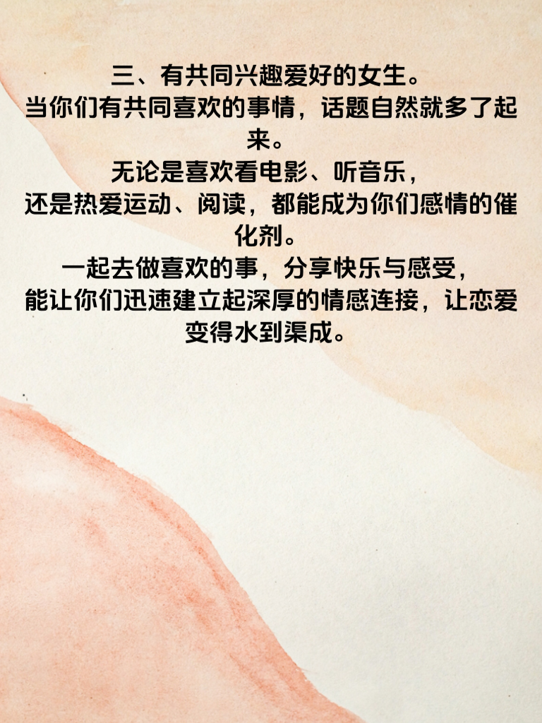 一、性格开朗的女生。这类女生就像小太阳,总是充满活力,笑容能驱散阴霾。和她们相处,你会时刻被积极的氛围感染。追求她们时,不妨多参与她们的社交活动,一起去参加朋友聚会、户外运动等。在轻松愉快的氛围中,更容易拉近彼此距离,让感情升温。 二、内心善良的女生。善良是她们最宝贵的品质,她们富有同情心,乐于帮助他人。你可以在生活细节中展现你的善良,比如一起去做公益活动,或者在她遇到困难时及时伸出援手。用你的善良回应她的善良,能让她感受到你的真诚,从而更容易对你心动。 三、有共同兴趣爱好的女生。当你们有共同喜欢的事情,话题自然就多了起来。无论是喜欢看电影、听音乐,还是热爱运动、阅读,都能成为你们感情的催化剂。一起去做喜欢的事,分享快乐与感受,能让你们迅速建立起深厚的情感连接,让恋爱变得水到渠成。