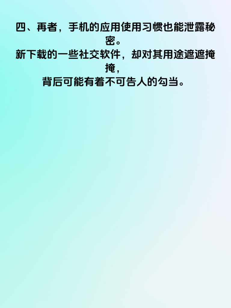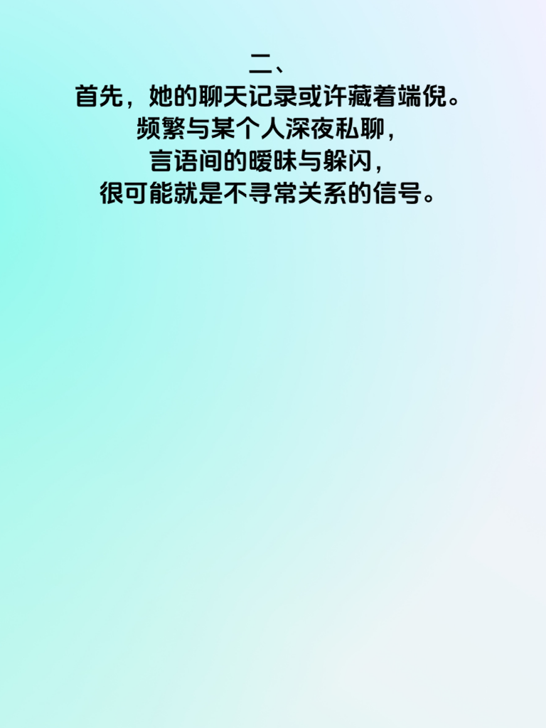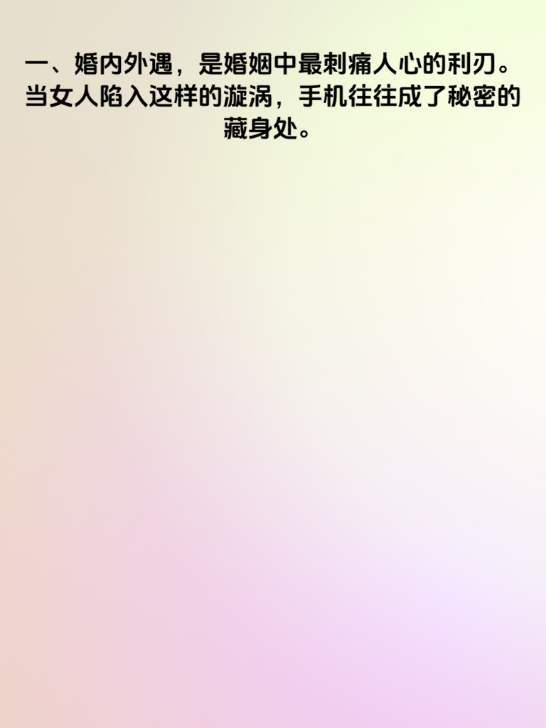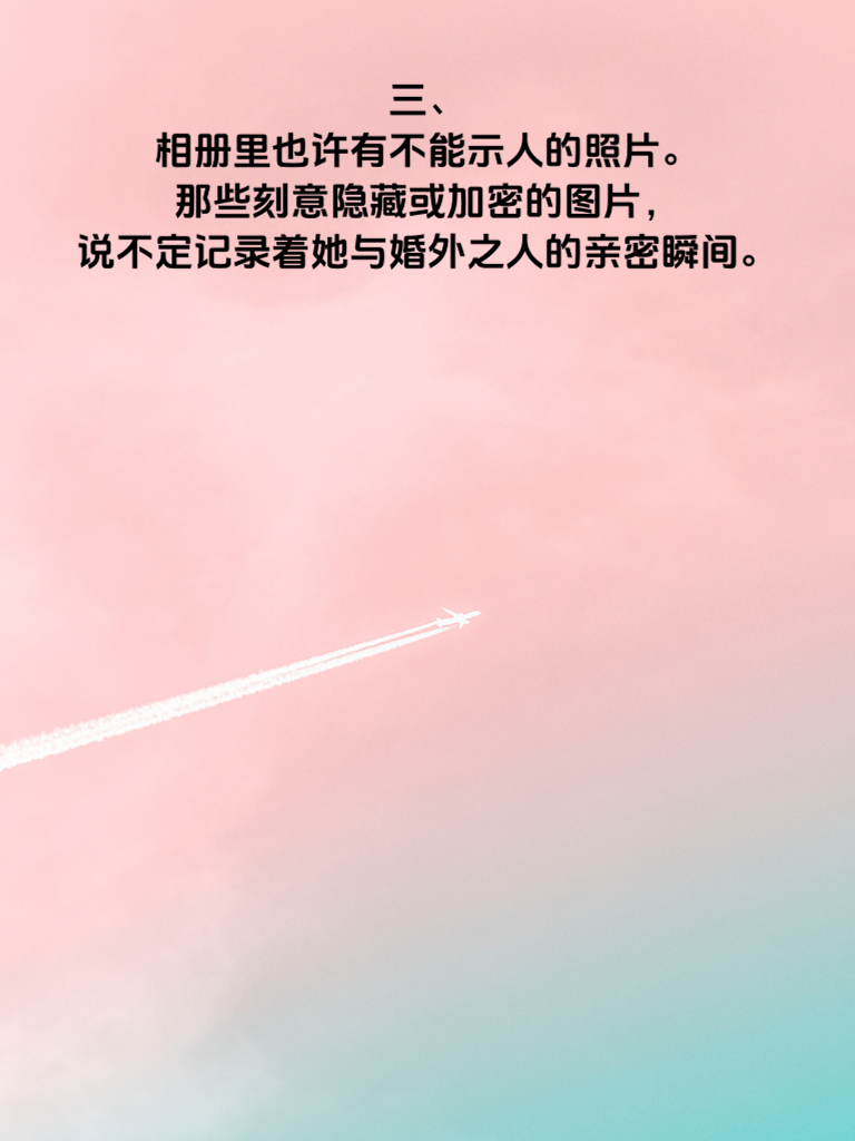 一、婚内外遇,是婚姻中最刺痛人心的利刃。当女人陷入这样的漩涡,手机往往成了秘密的藏身处。 二、首先,她的聊天记录或许藏着端倪。频繁与某个人深夜私聊,言语间的暧昧与躲闪,很可能就是不寻常关系的信号。 三、相册里也许有不能示人的照片。那些刻意隐藏或加密的图片,说不定记录着她与婚外之人的亲密瞬间。 四、再者,手机的应用使用习惯也能泄露秘密。新下载的一些社交软件,却对其用途遮遮掩掩,背后可能有着不可告人的勾当。 五、女人若有婚内外遇,手机里的这些秘密就像定时炸弹。作为伴侣,要敏锐察觉这些信号,及时沟通与解决,才能避免婚姻走向无可挽回的深渊。但发现问题后,也要冷静理智地处理,不要冲动行事,毕竟婚姻不易,修复关系才是关键。