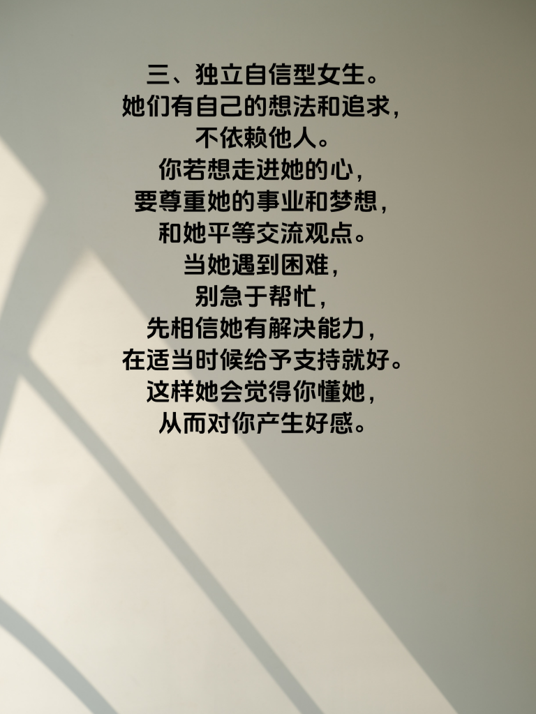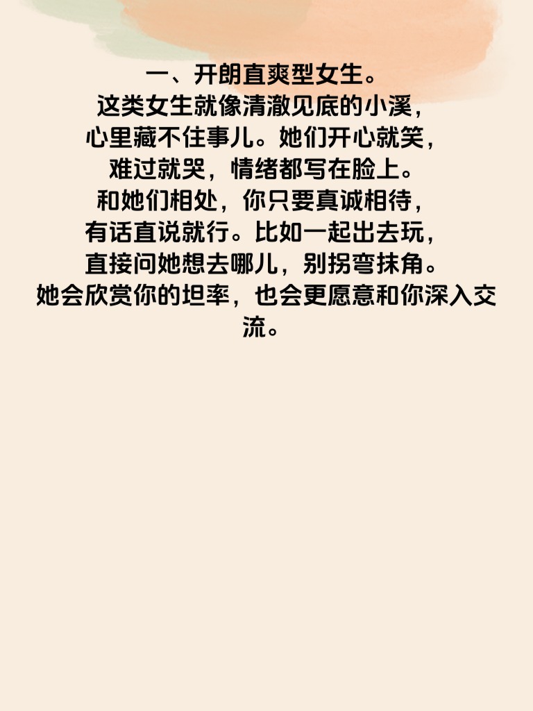 一、开朗直爽型女生。这类女生就像清澈见底的小溪,心里藏不住事儿。她们开心就笑,难过就哭,情绪都写在脸上。和她们相处,你只要真诚相待,有话直说就行。比如一起出去玩,直接问她想去哪儿,别拐弯抹角。她会欣赏你的坦率,也会更愿意和你深入交流。 二、温柔体贴型女生。她们心思细腻,很在意他人感受。想读懂她们的心,要多关注生活细节。比如她生病时,及时送上关心和照顾;天冷了,提醒她添衣。平时交流时,耐心倾听她的想法,给她温暖的回应,让她感受到你的贴心,她就会慢慢对你敞开心扉。 三、独立自信型女生。她们有自己的想法和追求,不依赖他人。你若想走进她的心,要尊重她的事业和梦想,和她平等交流观点。当她遇到困难,别急于帮忙,先相信她有解决能力,在适当时候给予支持就好。这样她会觉得你懂她,从而对你产生好感。