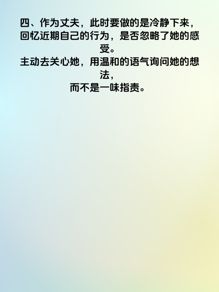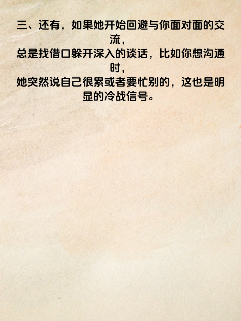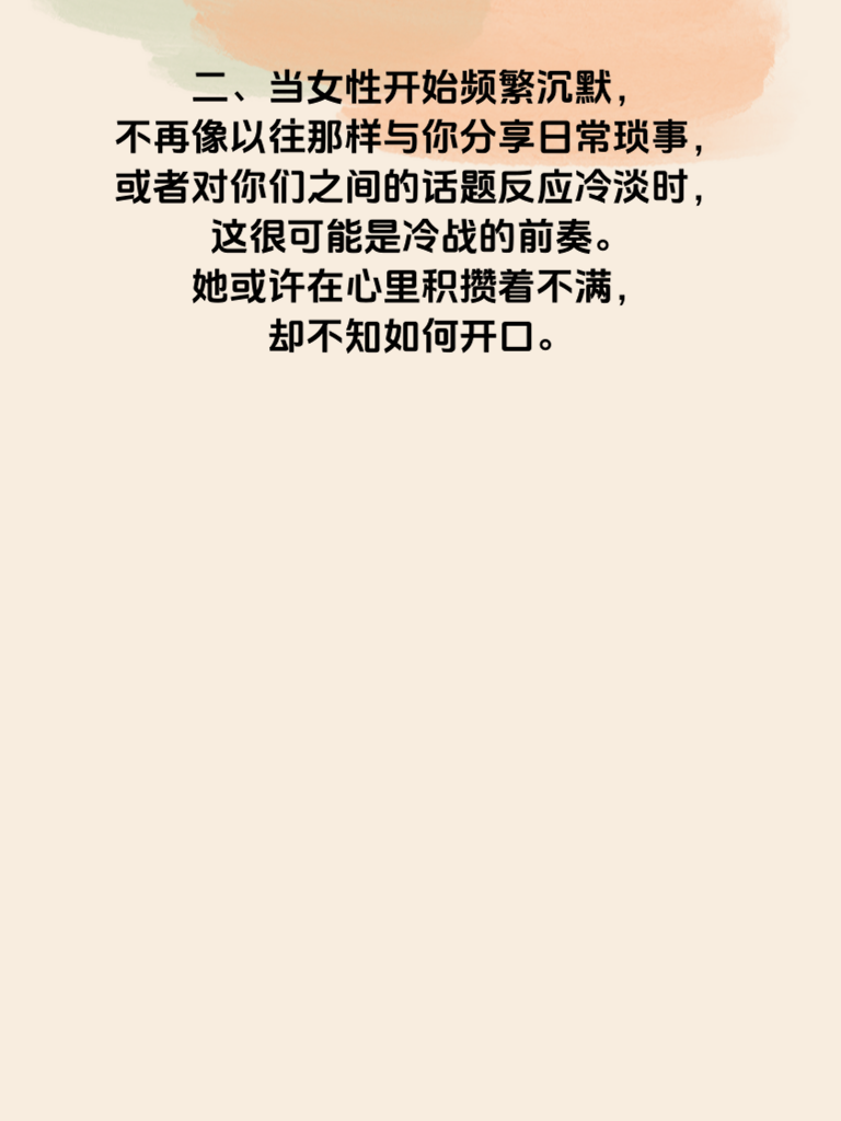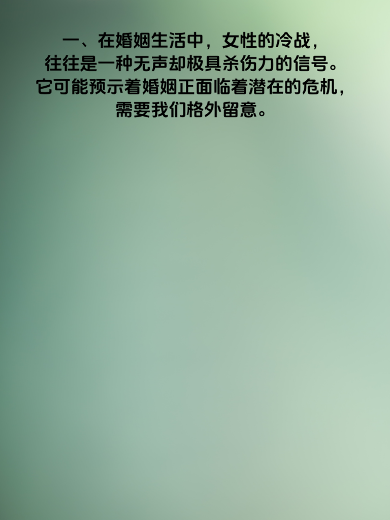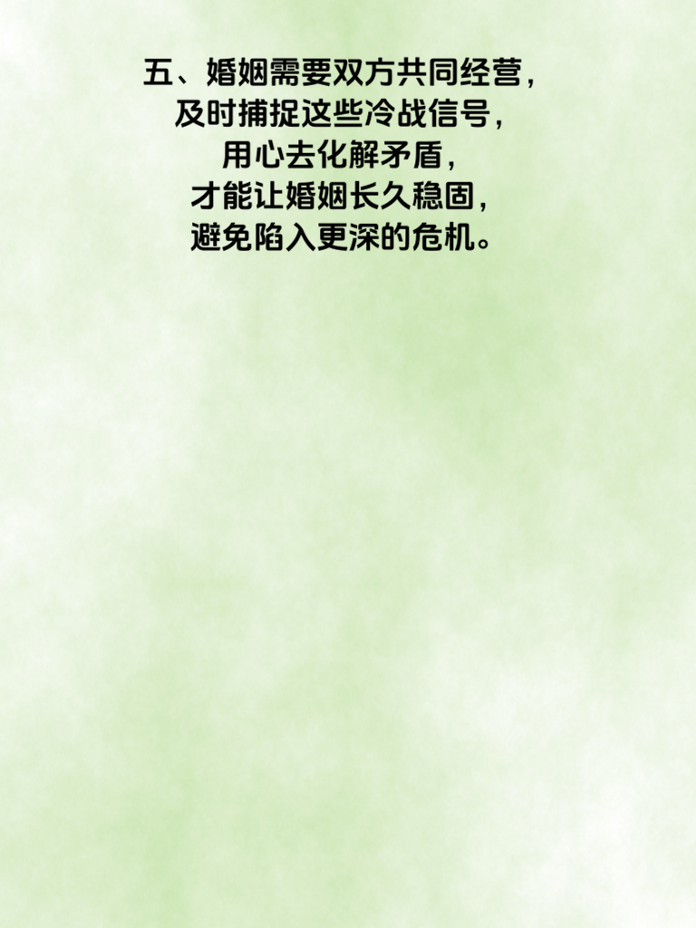 一、在婚姻生活中,女性的冷战往往是一种无声却极具杀伤力的信号。它可能预示着婚姻正面临着潜在的危机,需要我们格外留意。 二、当女性开始频繁沉默,不再像以往那样与你分享日常琐事,或者对你们之间的话题反应冷淡时,这很可能是冷战的前奏。她或许在心里积攒着不满,却不知如何开口。 三、还有,如果她开始回避与你面对面的交流,总是找借口躲开深入的谈话,比如你想沟通时,她突然说自己很累或者要忙别的,这也是明显的冷战信号。 四、作为丈夫,此时要做的是冷静下来,回忆近期自己的行为,是否忽略了她的感受。主动去关心她,用温和的语气询问她的想法,而不是一味指责。 五、婚姻需要双方共同经营,及时捕捉这些冷战信号,用心去化解矛盾,才能让婚姻长久稳固,避免陷入更深的危机。