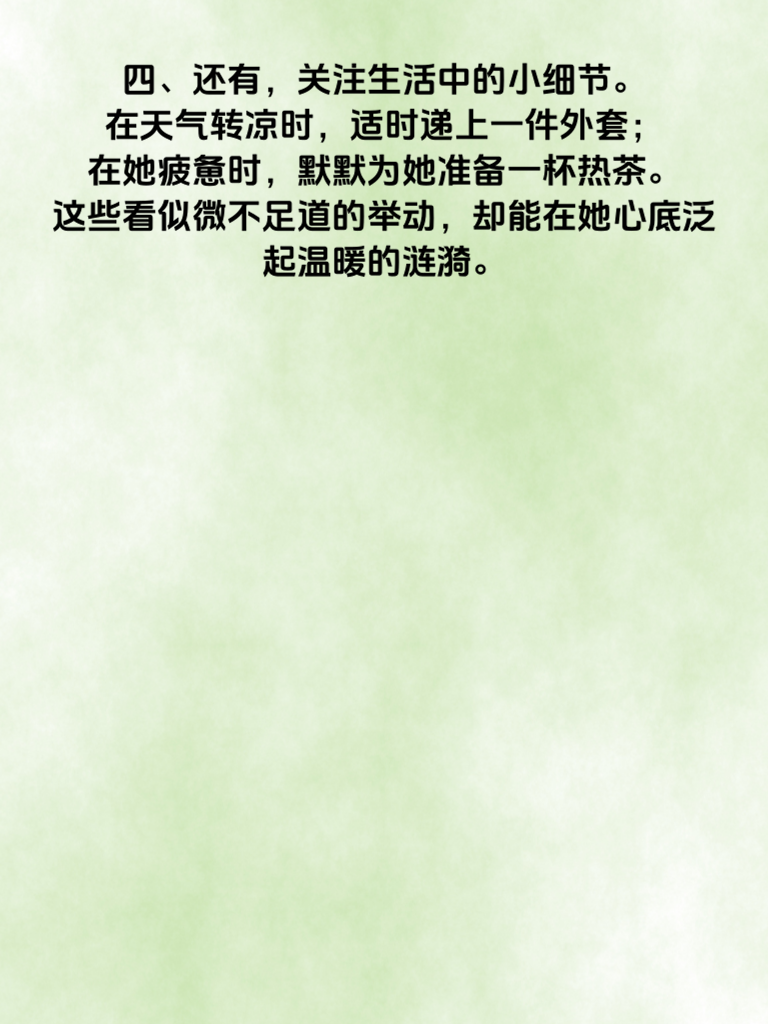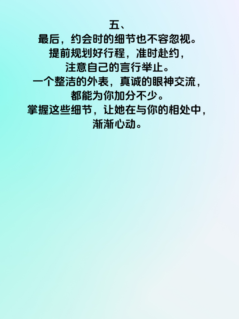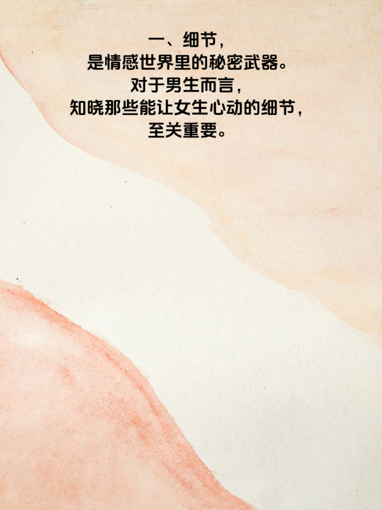 一、细节,是情感世界里的秘密武器。对于男生而言,知晓那些能让女生心动的细节,至关重要。 二、首先,用心记住她的喜好。比如她喜欢的颜色、爱吃的食物、爱听的音乐。当不经意间送上一份契合她喜好的小礼物,或是带她去一家她心仪已久的餐厅,她会感受到你满满的在乎。 三、再者,注重相处时的礼貌。时刻保持微笑,耐心倾听她说话,不打断、不敷衍。尊重她的想法和感受,哪怕有分歧,也能心平气和地沟通,这会让她觉得与你相处舒适又安心。 四、还有,关注生活中的小细节。在天气转凉时,适时递上一件外套;在她疲惫时,默默为她准备一杯热茶。这些看似微不足道的举动,却能在她心底泛起温暖的涟漪。 五、最后,约会时的细节也不容忽视。提前规划好行程,准时赴约,注意自己的言行举止。一个整洁的外表,真诚的眼神交流,都能为你加分不少。掌握这些细节,让她在与你的相处中,渐渐心动。