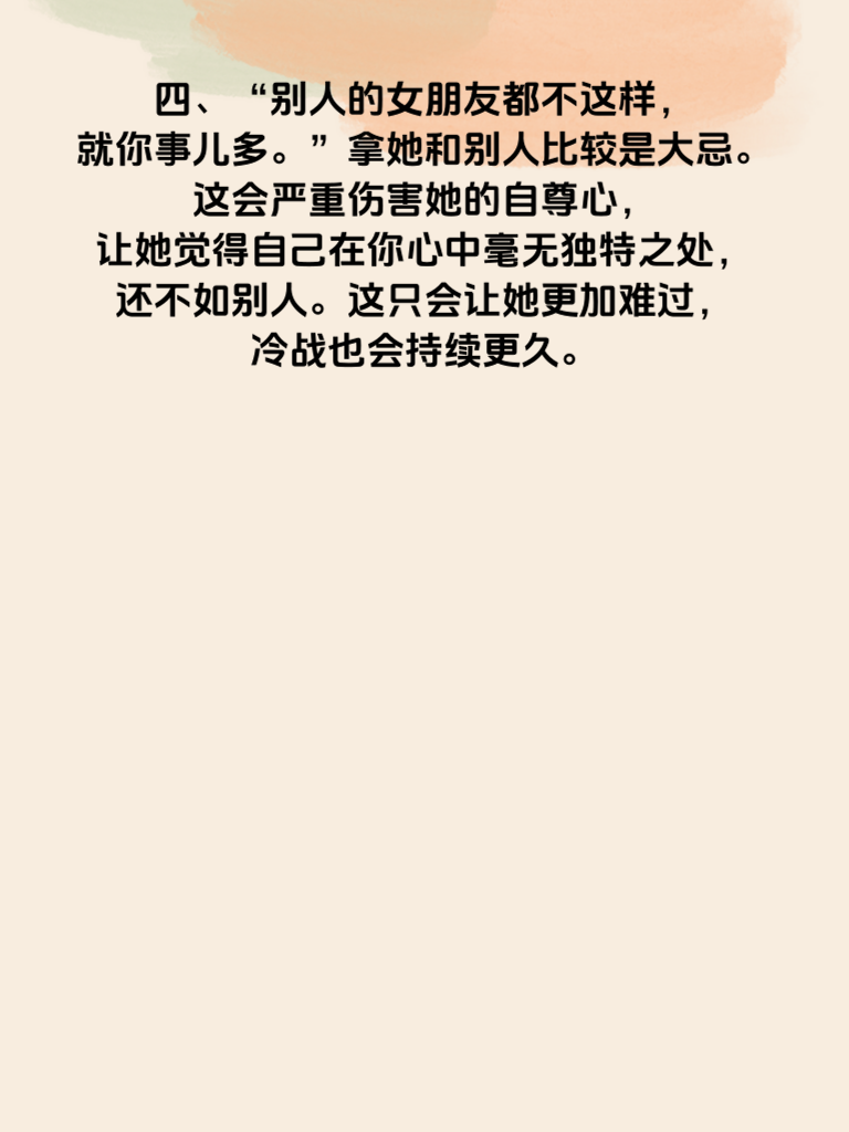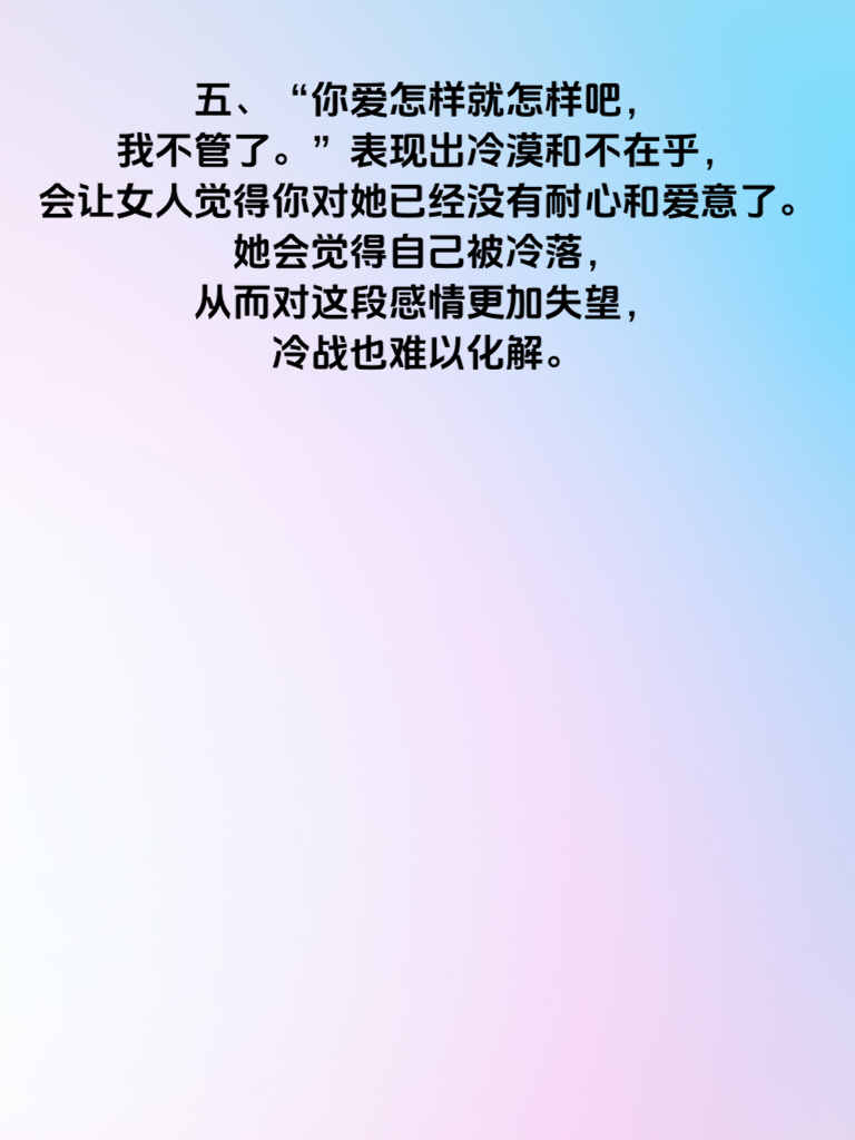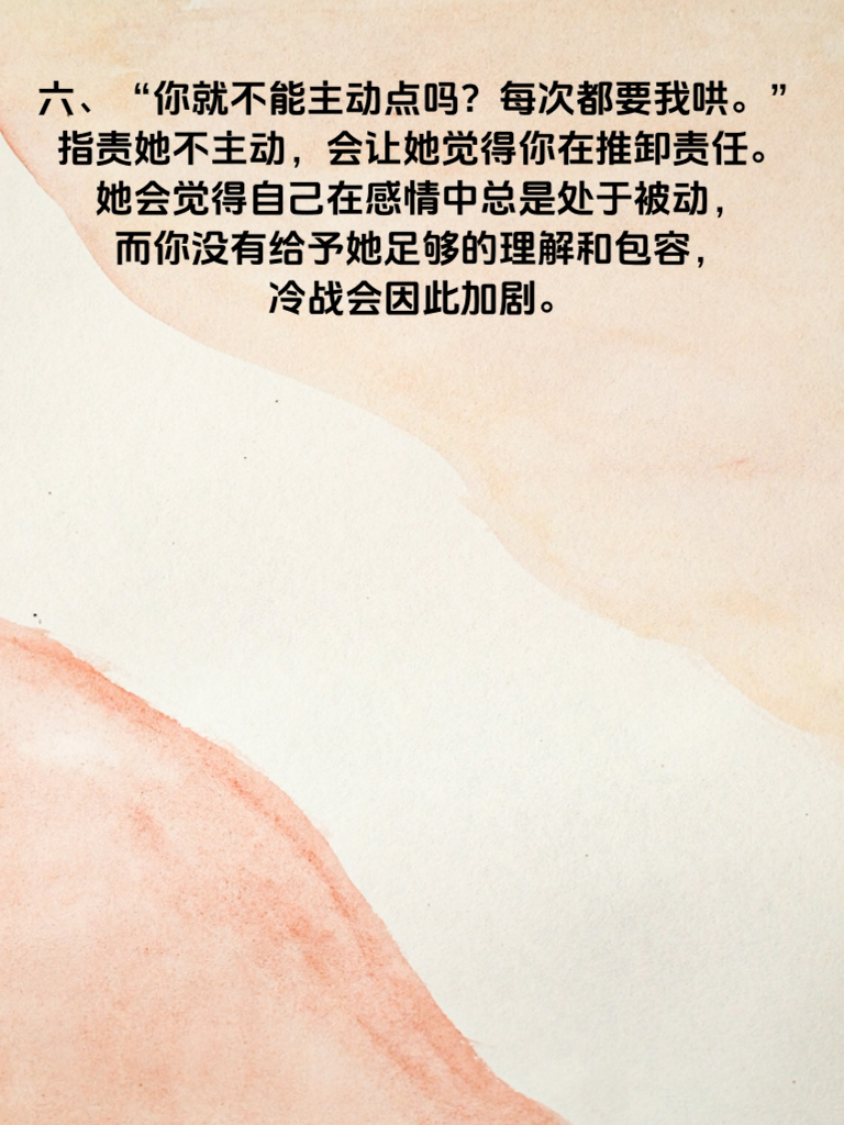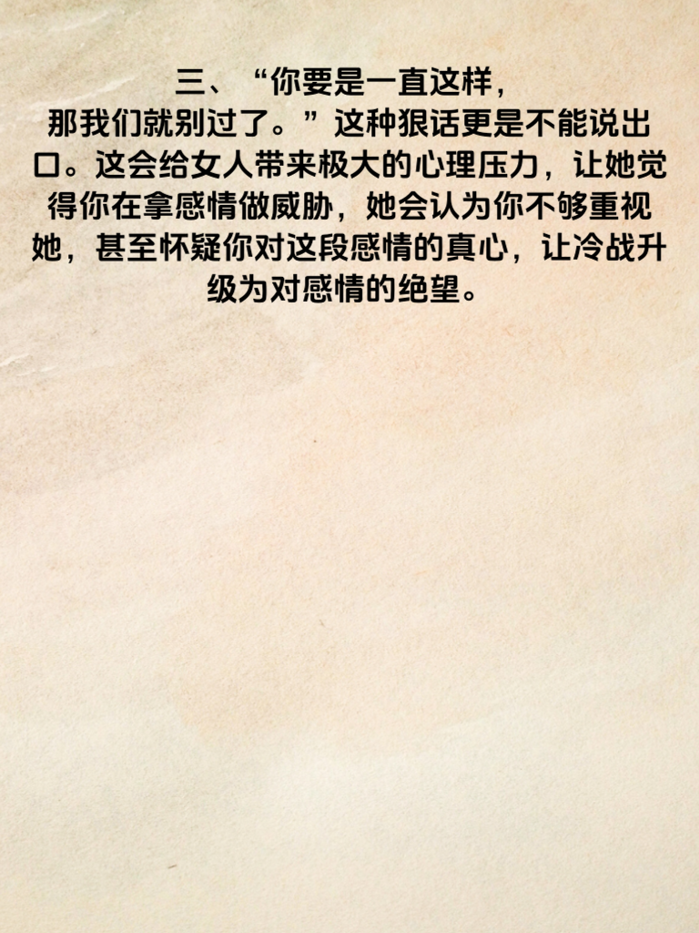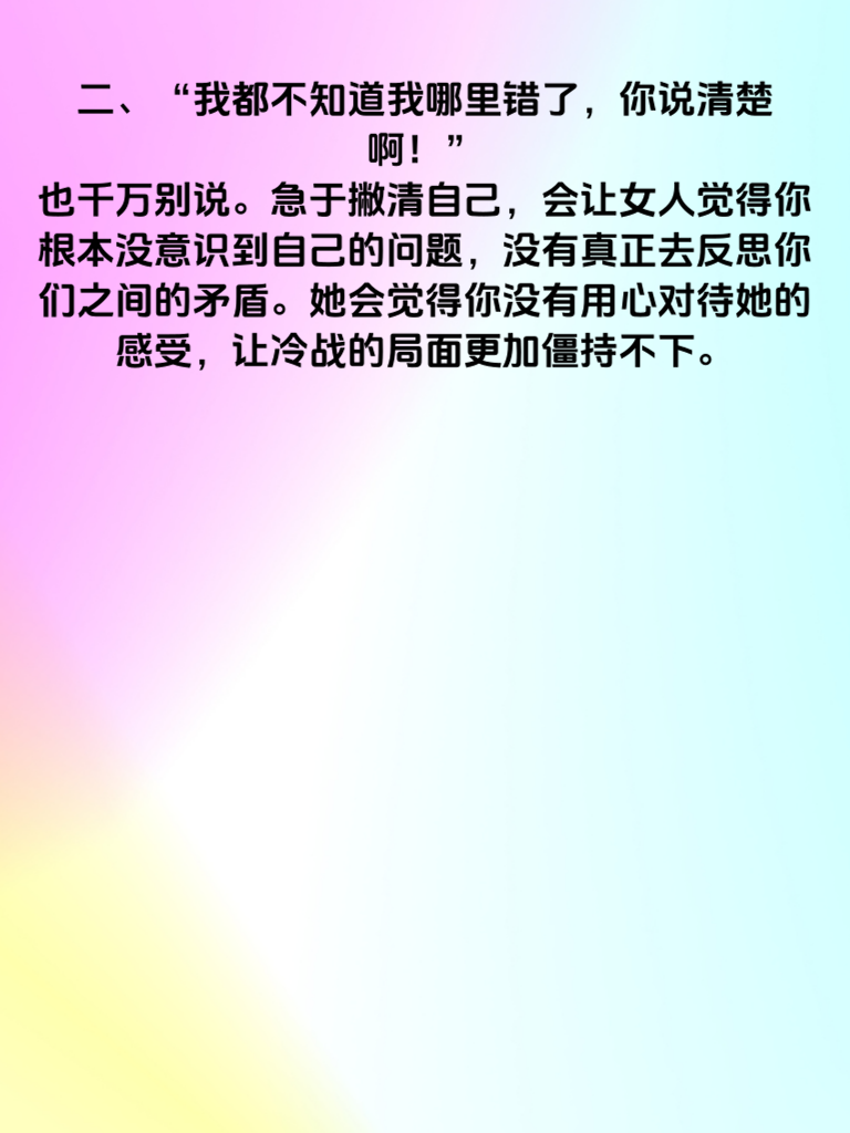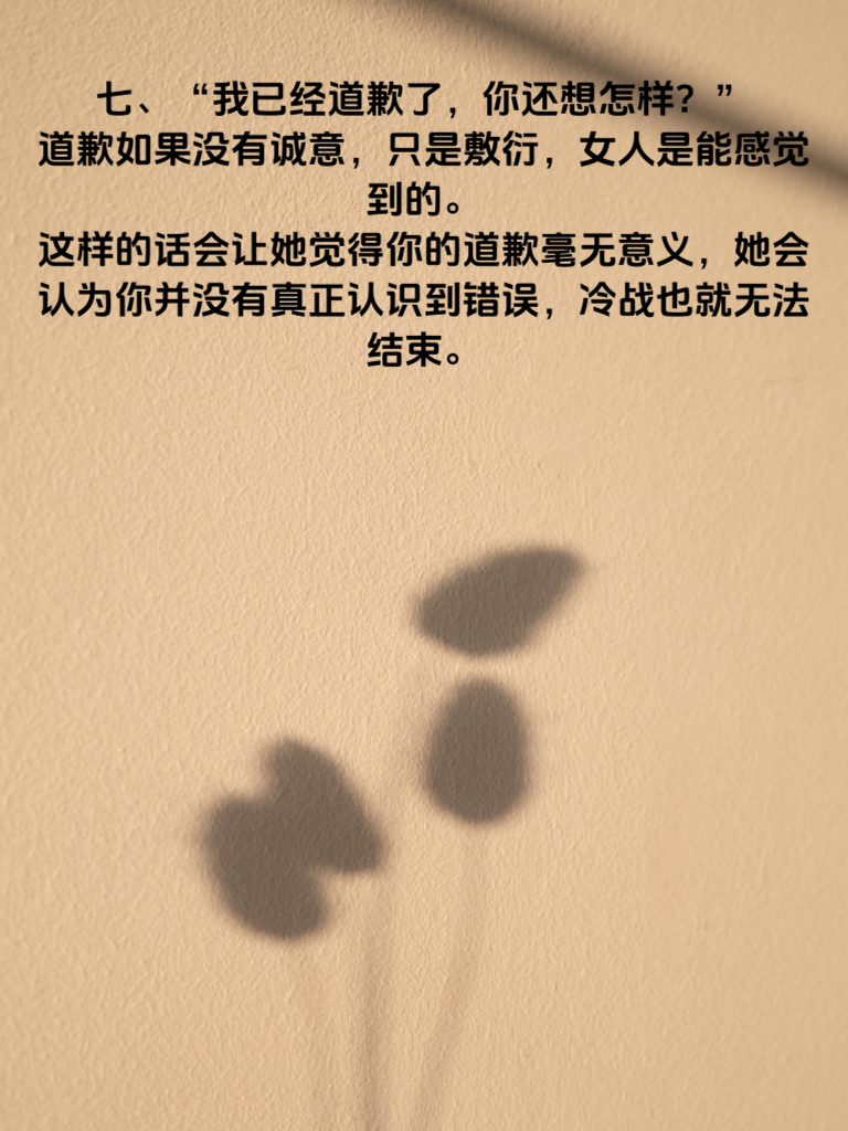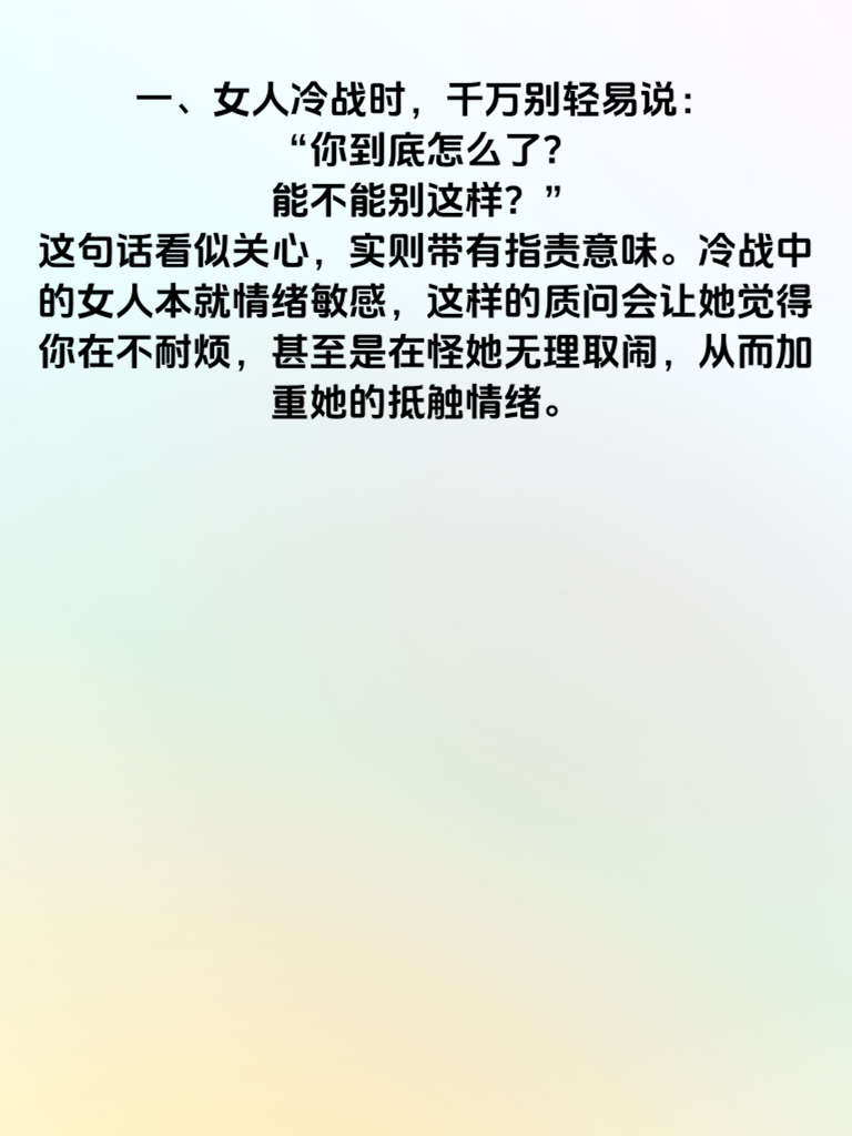 一、女人冷战时,千万别轻易说“你到底怎么了?能不能别这样?”。这句话看似关心,实则带有指责意味。冷战中的女人本就情绪敏感,这样的质问会让她觉得你在不耐烦,甚至是在怪她无理取闹,从而加重她的抵触情绪。 二、“我都不知道我哪里错了,你说清楚啊!”也千万别说。急于撇清自己,会让女人觉得你根本没意识到自己的问题,没有真正去反思你们之间的矛盾。她会觉得你没有用心对待她的感受,让冷战的局面更加僵持不下。 三、“你要是一直这样,那我们就别过了。”这种狠话更是不能说出口。这会给女人带来极大的心理压力,让她觉得你在拿感情做威胁,她会认为你不够重视她,甚至怀疑你对这段感情的真心,让冷战升级为对感情的绝望。 四、“别人的女朋友都不这样,就你事儿多。”拿她和别人比较是大忌。这会严重伤害她的自尊心,让她觉得自己在你心中毫无独特之处,还不如别人。这只会让她更加难过,冷战也会持续更久。 五、“你爱怎样就怎样吧,我不管了。”表现出冷漠和不在乎,会让女人觉得你对她已经没有耐心和爱意了。她会觉得自己被冷落,从而对这段感情更加失望,冷战也难以化解。 六、“你就不能主动点吗?每次都要我哄。”指责她不主动,会让她觉得你在推卸责任。她会觉得自己在感情中总是处于被动,而你没有给予她足够的理解和包容,冷战会因此加剧。 七、“我已经道歉了,你还想怎样?”道歉如果没有诚意,只是敷衍,女人是能感觉到的。这样的话会让她觉得你的道歉毫无意义,她会认为你并没有真正认识到错误,冷战也就无法结束。
