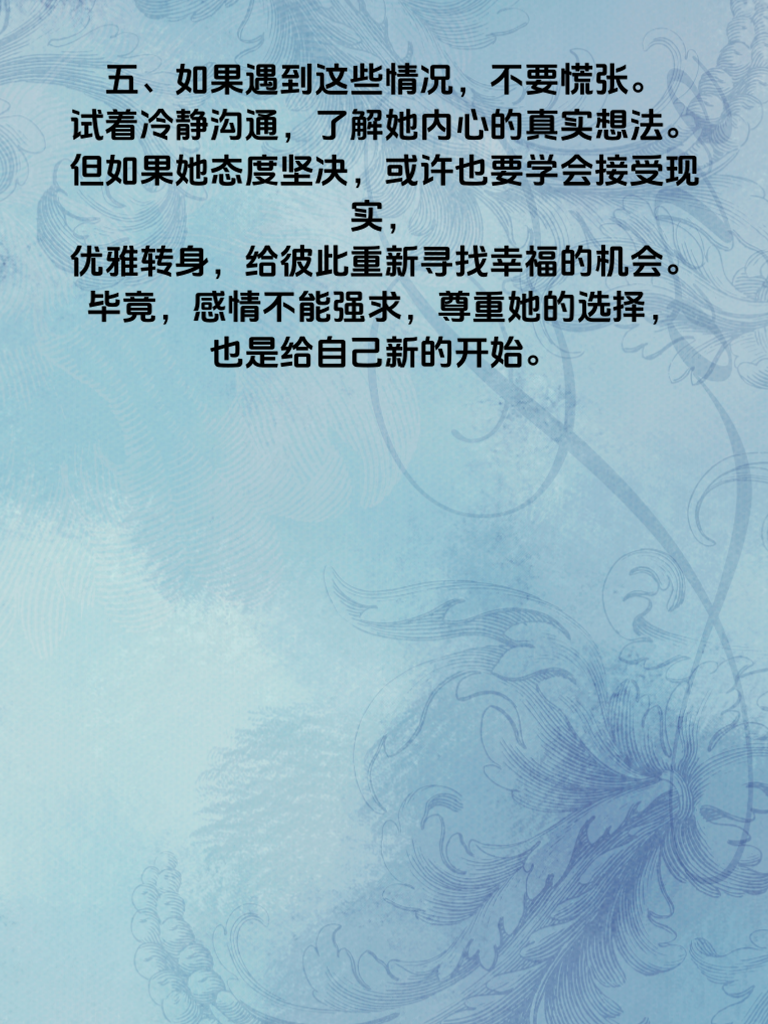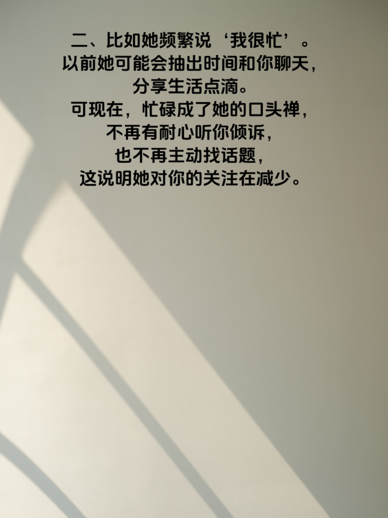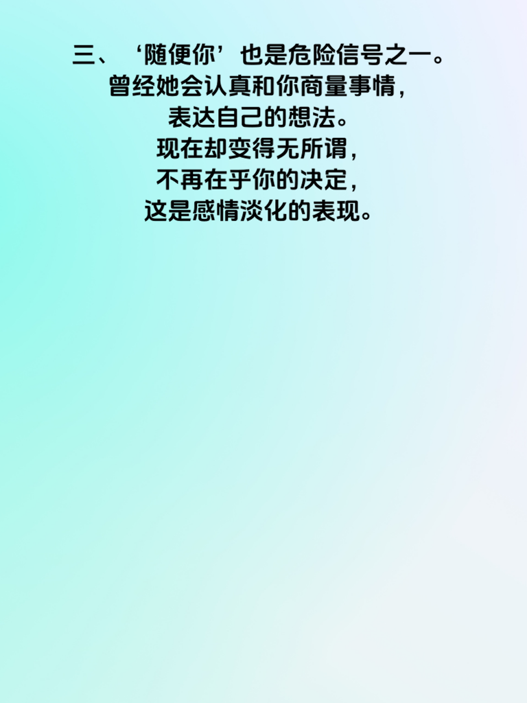 一、在感情的世界里,有时候一些细微的言语信号,就能透露很多信息。当她总发这几句话时,或许就代表她的心已渐行渐远。 二、比如她频繁说‘我很忙’。以前她可能会抽出时间和你聊天,分享生活点滴。可现在,忙碌成了她的口头禅,不再有耐心听你倾诉,也不再主动找话题,这说明她对你的关注在减少。 三、‘随便你’也是危险信号之一。曾经她会认真和你商量事情,表达自己的想法。现在却变得无所谓,不再在乎你的决定,这是感情淡化的表现。 四、还有‘我们不合适’。当她开始频繁提及这个,可能是她内心经过深思熟虑后的结论。她不再愿意为这段感情努力磨合,心已慢慢飘向远方。 五、如果遇到这些情况,不要慌张。试着冷静沟通,了解她内心的真实想法。但如果她态度坚决,或许也要学会接受现实,优雅转身,给彼此重新寻找幸福的机会。毕竟,感情不能强求,尊重她的选择,也是给自己新的开始。