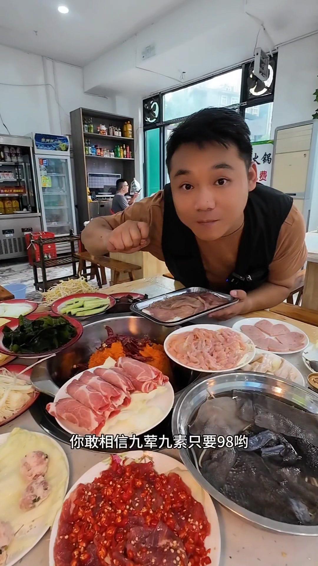 🥘菜品种类:鸭肠、老肉片、鲜肉丸子、美的午餐肉、虾尖、鲳鱼、五常鲜毛肚、大刀腰、下剁椒牛肉、鲜鸭肠。 🍡配菜:9个素菜,包含锅底,8个油碟。 💰价格:98元,人均不到20元。 📌注意:活动都在左下角,赶紧囤哦。