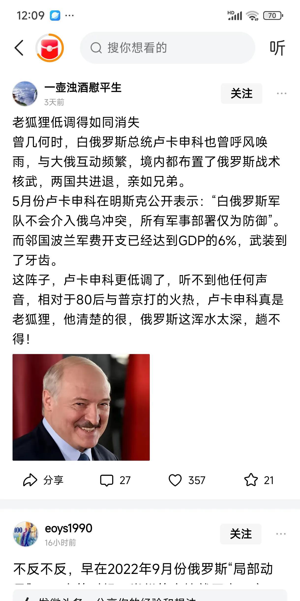 卢卡申科在俄乌冲突上自我禁言了。从开战至今,卢上校一直很活跃,与大帝共进退。 最近一段时间,在俄乌问题上,老卢不发表意见了。 俄乌战争,就在白俄家门口,战况如何,老卢心里很清楚。 老卢不说无非是两种情况:卖个关子,或难于启口。