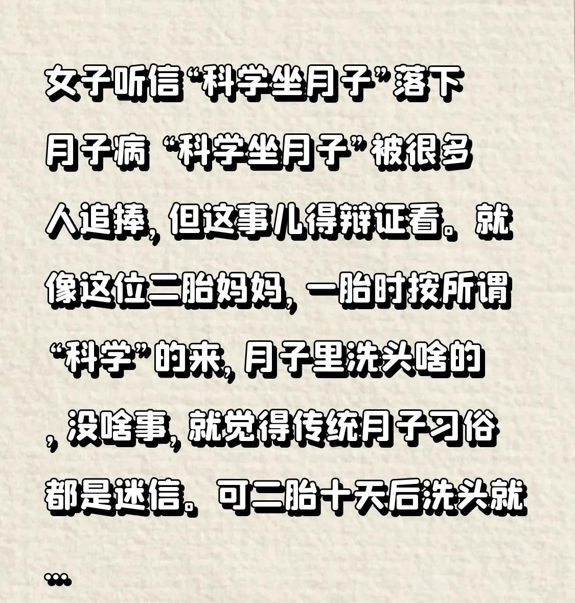 女子听信“科学坐月子”落下月子病 “科学坐月子”被许多人推崇,然而这事儿得辩证地看待。有这么一位二胎妈妈,她生头胎的时候按照所谓“科学”的方式坐月子,月子里洗头之类的,身体也没出现什么问题,于是就觉得传统的月子习俗全是迷信。 可是到了生二胎的时候,产后十天她洗了头,结果就落下了月子病。实际上,“科学坐月子”的理念本身并没有错,只是或许还不够周全。传统月子习俗里的一些做法也并非毫无依据,就像防风保暖这一点。 如今很多关于“科学坐月子”的说法也许仅仅在理论上可行,在实际操作的时候,得综合个人的身体状况、环境等诸多因素。不能盲目地去相信某一种说法,毕竟温度、个人体质不一样,月子里能不能洗头、什么时候洗头,可不能一概而论,否则就真的可能像这位妈妈一样,落下病根之后才追悔莫及。#坐月子# #农村坐月子习俗# #科学月子护理# #北方人坐月子#