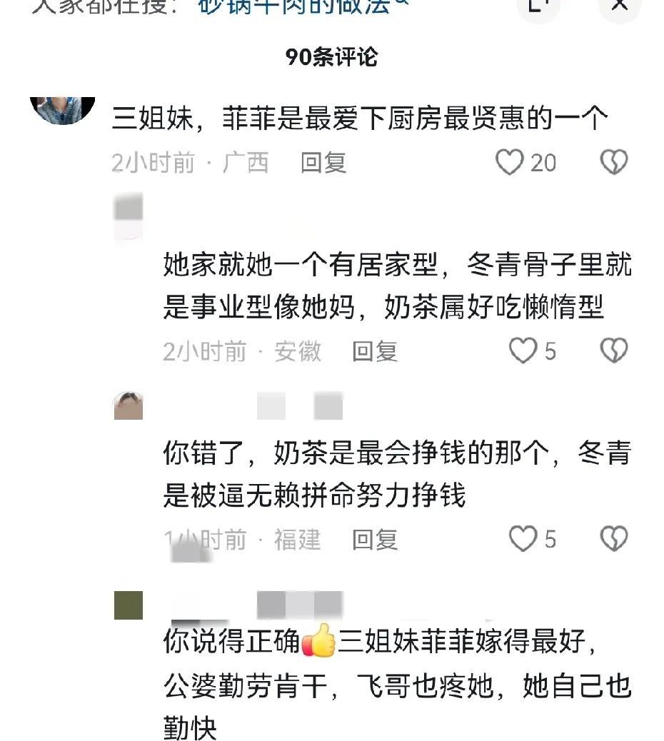 菲菲女儿来了,飞哥安排大餐。 甜甜到妈妈家去了,大气的飞哥买了一堆菜回去,让菲菲全都做出来。菲菲觉得太多,做了吃不完,飞哥坚持要多做点儿菜,要不然别人会说他小气不舍得给闺女吃。看看,豪气的飞哥怎么会是小气的人呢?何况就点儿吃的,这年头谁还差口吃食! 菲菲在三姐妹中,确实是贤妻良母型,看起来也是会好好过日子的女人,前提是要找个会搞钱的男人。不然,又贤妻良母又女强人也搞不过来,是人不是神。评论区把姐妹仨拿来对比,对于菲菲没异义,最漂亮最贤惠,跟飞哥也互补。对于奶总和二姐,各抒己见,有人认为二姐最厉害,有人认为主持大局还得奶总。那么,你们认为她姐妹俩谁赚钱更厉害?