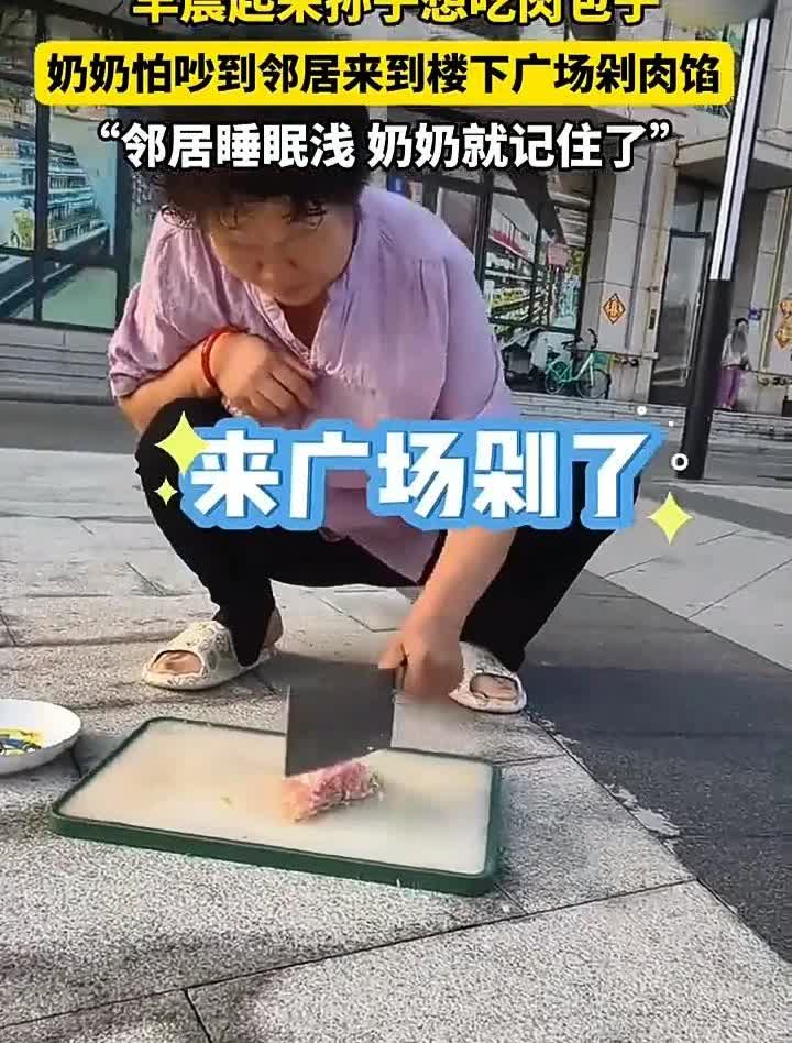 中国好邻居!7月13日,天津一名女子发视频称,自己的孩子一大早跟奶奶说想吃肉包子,奶奶剁肉馅时,因为怕吵到睡眠浅的邻居,于是直接下楼到广场上剁肉馅,表示在这里剁得再大声,都不会吵到邻居。 看到这位奶奶怕吵到邻居下楼到广场上剁肉馅的举动,真的令人感到暖心。这位奶奶太善良了,因为邻居曾说过自己睡眠浅,所以她就记在了心里,为了不吵到邻居,宁愿下楼去广场上剁肉馅,有这样通情达理的邻居真是一种福气。大家怎么看呢?