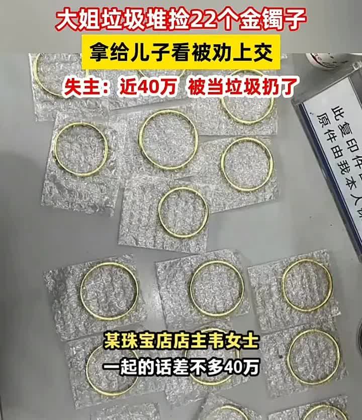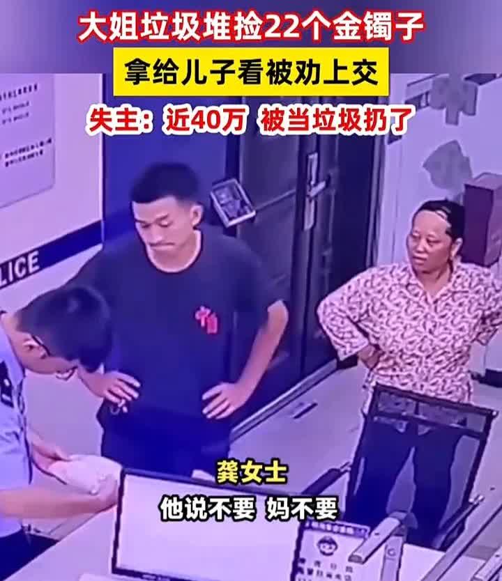 这个儿子太明事理了!近日,广西柳州一位老人在垃圾桶里捡到一包金镯子,拿回家给儿子看,儿子当即表示“妈,这个东西很贵,咱们不能要”,于是连忙把金镯子送到派出所,之后才知道是一家金店的员工误扔了,价值超过40万。 看到这名男子把母亲捡到的金镯子送到派出所的举动,真的令人感到暖心。这名男子非常通情达理,他一眼看出母亲捡到的金镯子价值不菲,肯定是别人不小心丢失的,所以第一时间送到派出所,这种拾金不昧的做法,值得所有人敬佩和学习。大家怎么看呢?