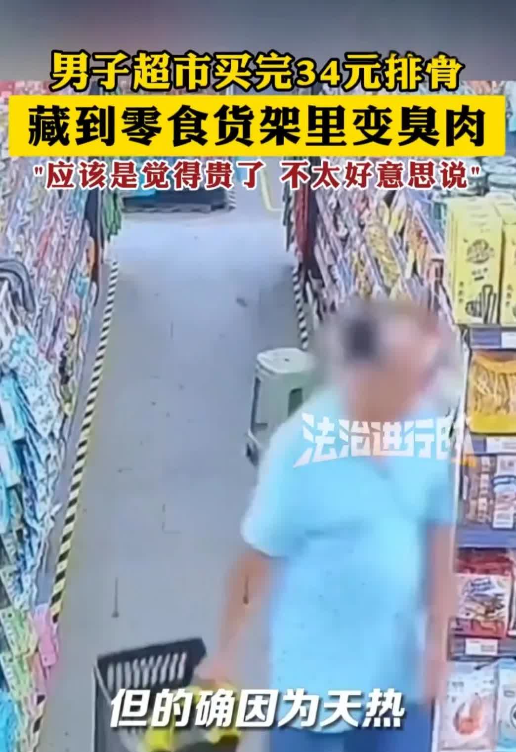 三十四块钱排骨上热搜了㇏ 近日,河南驻马店。一男子在超市买完排骨秤量后34元,藏到零食货架成,导致排骨变质发臭。 真是看来做什么都不容易啊,吃个排骨还偷着藏着,没有钱啊。超市也是竟然等到臭了再取,好歹配嗅觉好点狗能闻出来。 人平时应多做点好事,多去帮助别人,给自己积累福报。