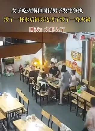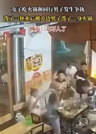 7月16日,广东一名女子,在火锅店与一名男子起了争执,她用水泼向那名男子。坐在男