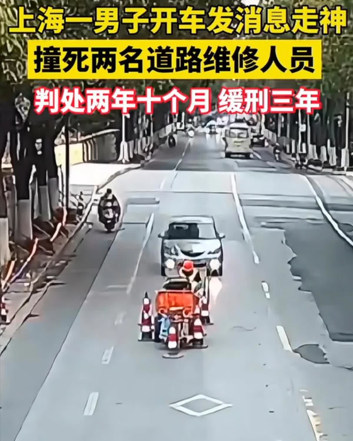 害人还害己!只因为他开车发消息竟然将两个正在进行道路维修的工人撞死 事发今年2月,上海一男子开车时和朋友发消息走神,没有看到在路前维修道路的两个工人直接从两人身上撞了过去,两名工人终因伤势过重身亡 事后男子到案自愿认罪认罚,积极赔偿,最终判处男子两年十个月缓刑三年 男子因为不遵守安全行车规范,竟然开车时还发手机消息,终酿成如此严重后果,造成了两个无辜的生命离去,给两个家庭造成了极大的痛苦和伤害,我觉得判他两年多都太轻了,毕竟那是两条生命啊!