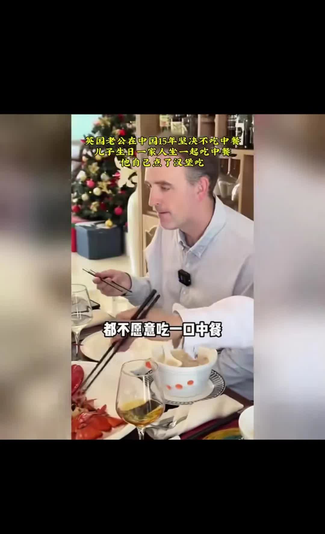 一位女子发视频说:她的英国老公在中国定居15年了,但是从来不吃中餐。儿子过生日那天,家里请来了大厨,做了一大桌丰富的中餐,全家人吃得非常高兴,而自己英国老公却一口没动,只是点了一个汉堡外卖,和大家围坐在餐桌上庆祝孩子生日,在大家的劝说之中,勉强吃了一块红烧肉,但是未置评价,继续吃起了他的汉堡包! 大家说,和这样执拗的老公过一辈子也不容易吧?!