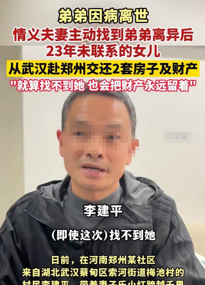 2025年3月28日,湖北一男子离异后,女儿被判给前妻,从此再无交集。不料,男子因病离世后,哥哥竟不远万里奔赴河南寻亲,只为将房产和存款交给孩子。网友:值得敬佩! 据媒体2025年3月28日报道,武汉蔡甸区的李国平因病离世,留下两套房产与存款。一个埋藏了23年的亲情故事,因他的离去骤然翻开了出人意料的篇章。哥哥李建平夫妇跨越千里,只为将弟弟的遗产亲手交到那个从未谋面的侄女手中。 原来,当年李国平在郑州成家生女,然而婚姻仅维系到女儿一岁便告终结,从此父女天各一方,音信全无。 李国平返回武汉后,在城区与索河老家均购置了房产。城区那套老屋历经拆迁,最终化作140平方米的商品房。 当部分族人建议将这份可观遗产转至李建平子女名下时,李建平斩钉截铁:我弟的血脉不该被遗忘,必须找到她!妻子乐小红亦坚定支持丈夫这自找麻烦的决定。 今年2月末,夫妻二人踏上郑州寻亲路。在警方与社区合力下,一个令人心酸的事实浮出水面,李国平的前妻在女儿李雨桐十岁时已意外离世,孩子由姨母艰难抚养成人,如今已是一名大四学生。 3月13日,郑州某社区内,这对从未谋面的伯父伯母终于见到了侄女。当姨母含泪告知雨桐父亲离世与房产之事时,这个年轻姑娘才第一次触及到来自父系血脉迟到的温度。李建平轻声叮嘱她暑假回汉办理继承手续:这是你爸的心血,也是我们的心意。 当这家人的事件被传到网上时,网友们在评论区瞬间成了“感动中国”提名现场,有网友表示:财产面前见人品,伯父伯母这波操作堪称道德天花板! 还有网友贴心的评论道:姑娘虽命途多舛,但姨母含辛茹苦育才,大伯诚信千里送还家产,不幸中的万幸啊! 参考资料: 夫妻决定:交还2套房—— 光明网2025-03-28