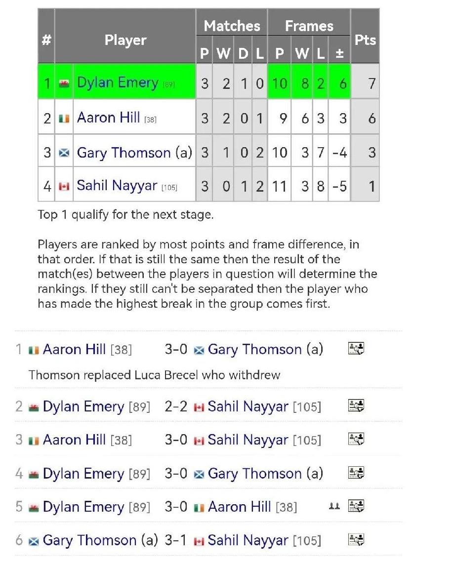 冠军联赛第一阶段结束,32强全部产生,其中中国球员占据10席。今天凌晨,徐思、埃默里晋级;范争一打出147。今天第二阶段比赛开打,吴安仪出战A组,张安达、袁思俊出战B组。 昨夜今晨,冠军联赛进行了第27组和第29组的比赛。先说第29组的结果,徐思2胜1平积7分晋级,海菲尔德2胜1负积6分排第二,范争一2平1负积2分排第三,14岁小将舒巴奇克1平2负积1分垫底。 今天凌晨,范争一第3场小组赛对阵徐思,在第二局比赛中打出单杆147,这是范争一职业生涯第二杆147,也是职业巡回赛第218杆147。范争一2平1负积2分,表现不佳,但打出147,挽回了一点面子。 第27组的比赛结果是:埃默里2胜1平积7分晋级。亚伦·希尔2胜1负积6分,排第二。加里·汤姆森和纳亚排第三和第四。 至此,冠军联赛第一阶段结束,32强全部产生。中国球员占据10席,他们分别是:姚朋成、袁思俊、张安达、吴安仪、吴宜泽、雷佩凡、庞俊旭、刘宏宇、刘文炜、徐思。 今天冠军联赛第二阶段开打,将进行A组和B组的比赛,吴安仪出战A组,张安达、袁思俊出战B组,小组第一名晋级8强。 A组4名球员是:吴安仪、奥康纳、斯莱瑟、海顿·平海。B组4名球员是:张安达、袁思俊、马奎尔、塔猜亚。 中国球员,加油!