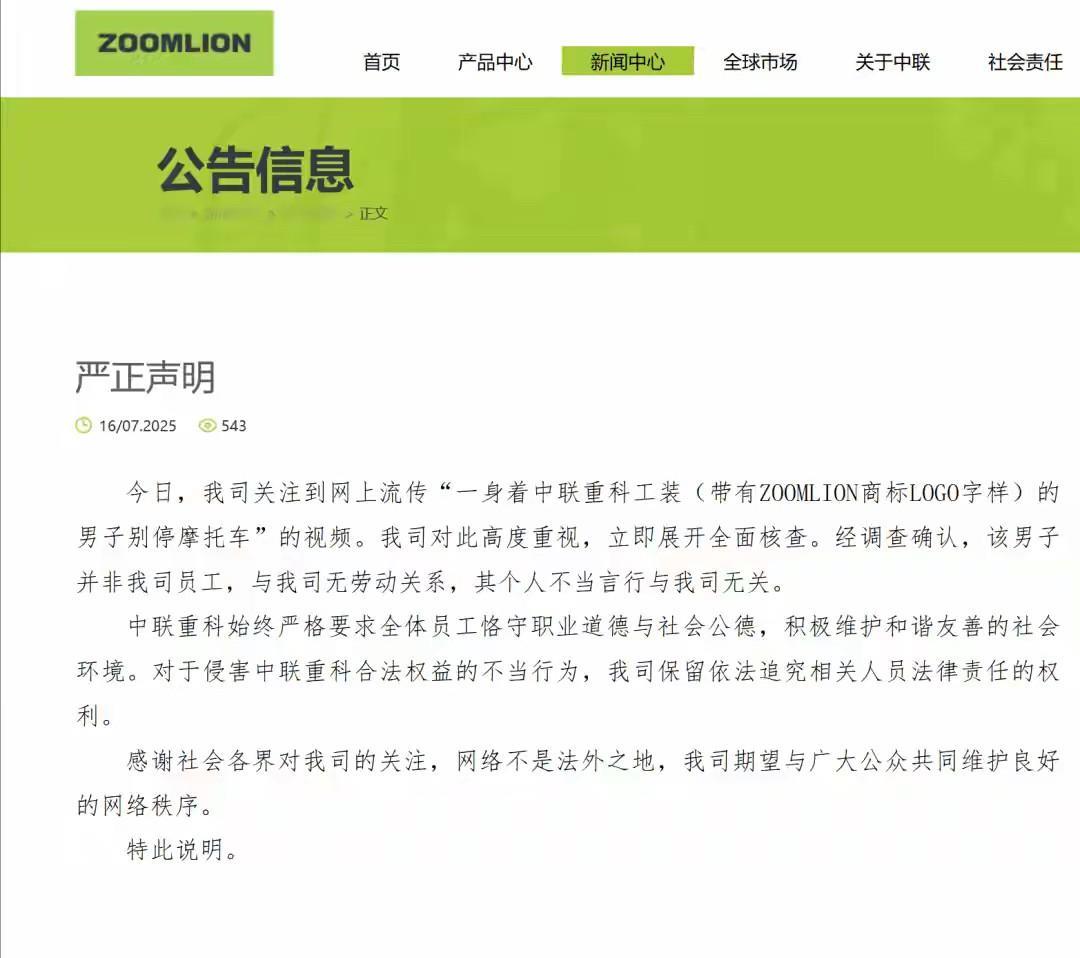 别停越野车辱骂骑手的嚣张男子已被警方拘留! 7月16日下午,小潘骑着摩托车正常行驶,在自己左前方有一辆黑色越野车,两车之间还隔着一条车道! 突然之间,越野车在没打转向灯的情况下,向右侧直接变道,小潘赶紧鸣笛示意,但越野车像没听到鸣笛声一样,直接将骑摩托车的小潘逼停在右侧画有黄色标识线的道路上! 两人同时停了下来,小潘质问越野车司机:引导线你怎么开的?你不认识引导线吗? 男子听到后把车横在了小潘的车前,明显就是把小潘的车别在那里! 男子下车后,双手插着腰,非常嚣张地说道:你管得着吗?你动我一下试试! 接下来男子骂小潘的话更是让人无法接受:你叽叽啥?撞你你TM活该,弄死你,给我滚远点等等辱骂威胁的话! 机智的摩托车司机小潘并没有和越野车男子纠缠,而是用手机录下了证据,并报了警! 虽然男子身上穿着“中联重科”的工装,但16日晚上中联重科股份有限公司已经发布声明:该男子并非中联重科员工! 图片来源网络侵可删