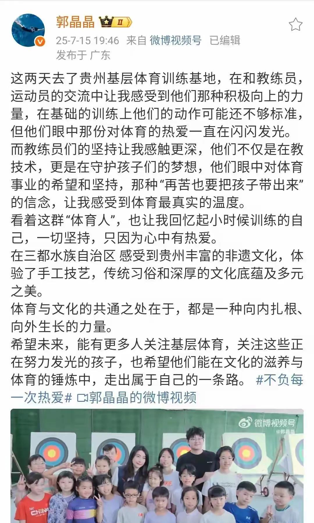郭晶晶和霍启刚写得真好,夫妻二人都是干实事的人。短短几天的贵州调研,就看到了当地基层体育教育的弱点,贵州不缺少能吃苦和有天赋的体育苗子,但要发现并培养好,是个很艰巨的任务。需要有一批有先进理念的教练员队伍和完善的训练基地。 夫妻二人会助力贵州的体育事业。 郭晶晶和霍启刚都是滿滿的正能量,他们作为事业成功的商人和体育精英。心系百姓。为基层的体育事业献计献策,提倡全民健身。发展普及基础训练而贡献自己的力量,他们也心系困难群体,做慈善事业捐款捐物,有着悲悯之心。这一对夫妻令人敬佩。值得点赞!