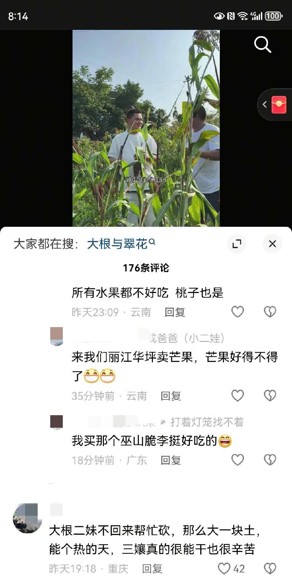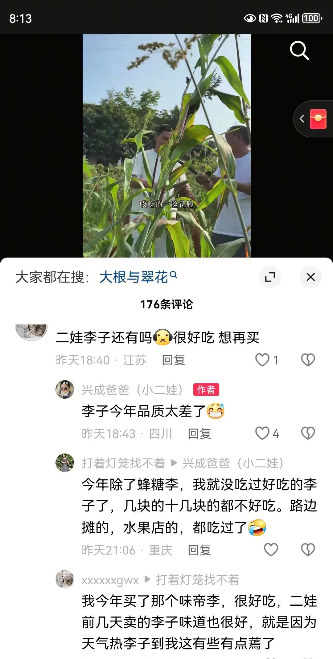 小二娃的真实回馈:今年李子品质差。 小二娃去三孃家玩儿 ,赶上三孃正磨刀准备去砍高粱。便打电话“忽悠”了两个兄弟过来帮忙,人多干活有劲儿,几下就弄完了,这个天儿不干活都热,小二娃还是蛮不错滴。 评论区有人还要在他家买李子,他的留言是:今年李子品质太差了。虽然他也卖过两次,但人家实话实说,买主自愿选择。不像有的网红,夸大其词,说今年的李子比去年好,9分甜1分酸,又甜又脆。其实呢!买过吃过的都知道,根本就不甜,有的会有点儿脆,有的是很柴,难吃得很。都是同在四川的网红,同样都是的水土天气种出来的果子,一个拼命忽悠,一个实话实说,人品高下立判。