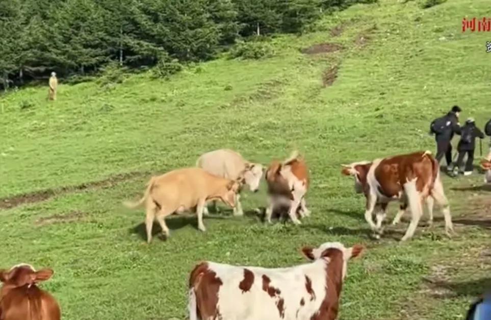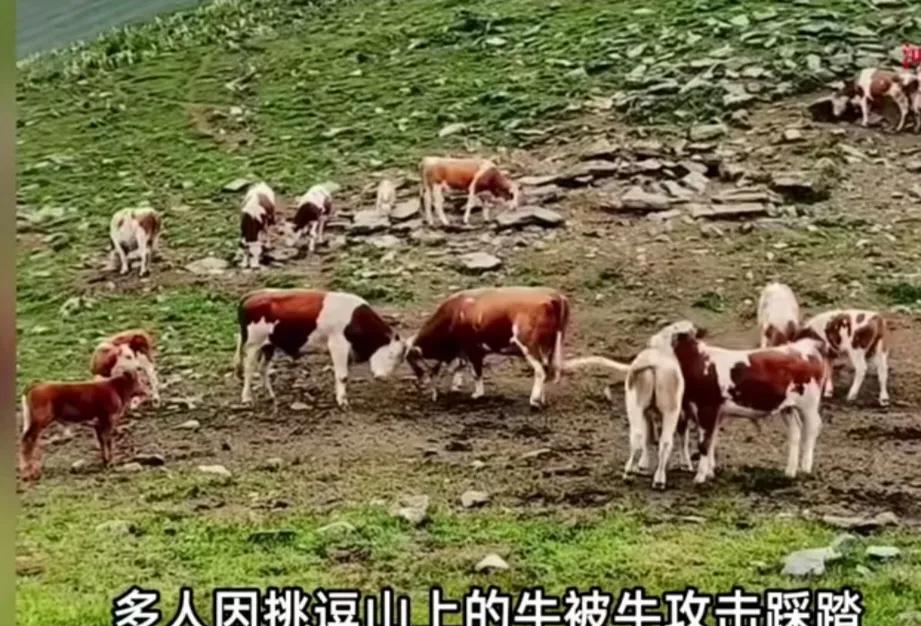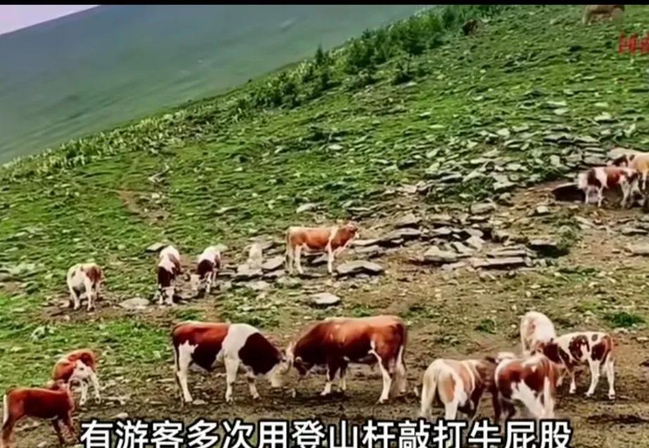 近日在五台山风景区,有游客在去朝台时,看见草地上散养了不少奶牛,游客上前投喂牛肉干,与奶牛互动,但有游客在互动时就过分了,竟然骑到奶牛身上,甚至拿棍子去捅奶牛的屁股,结果把奶牛惹怒了,遭到几头奶牛猛烈的踩踏。